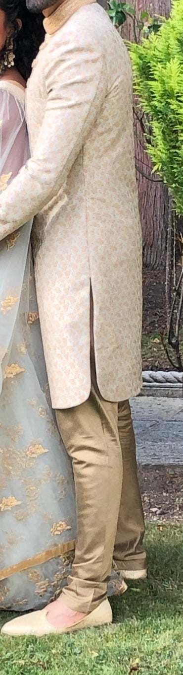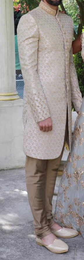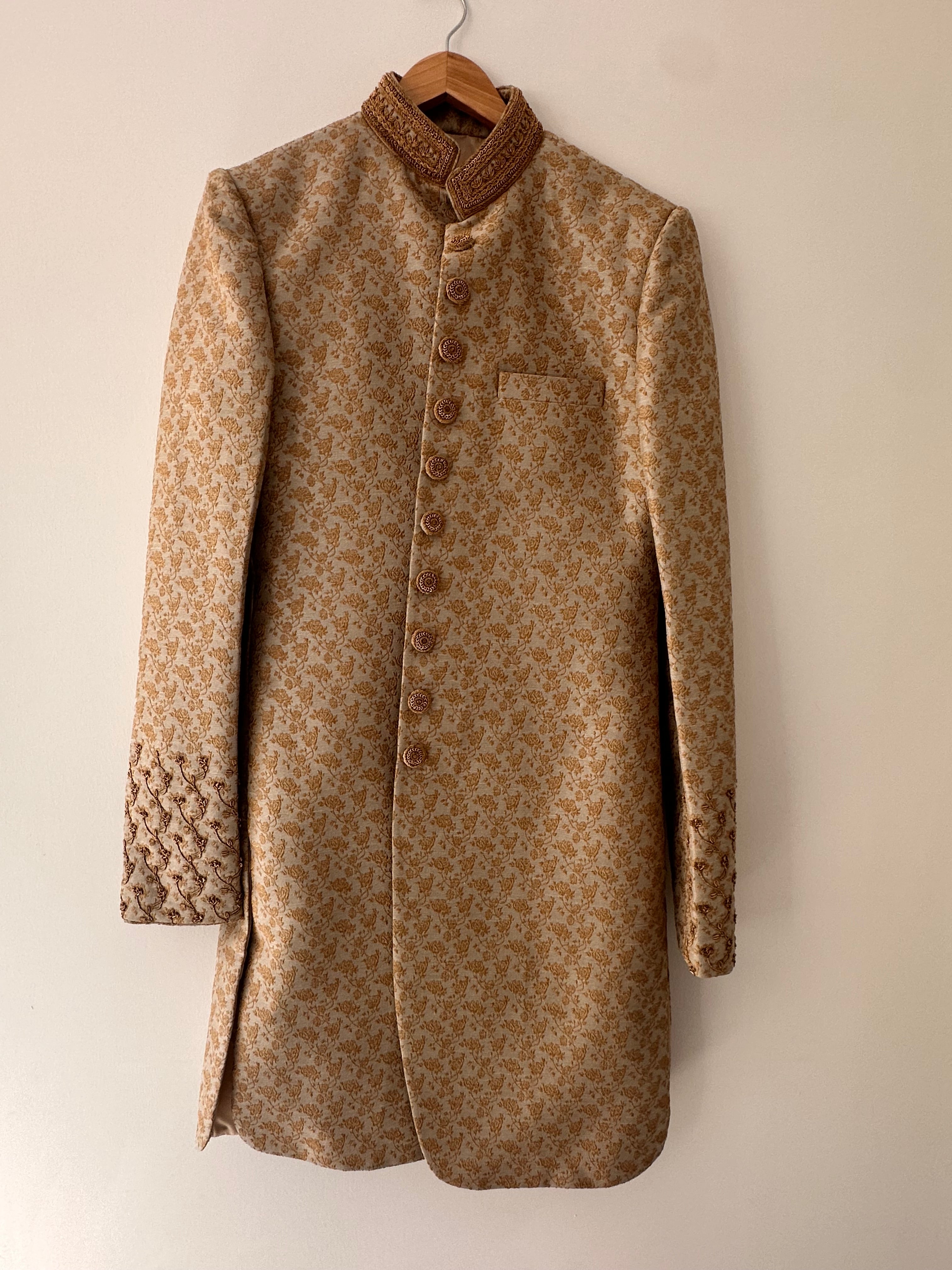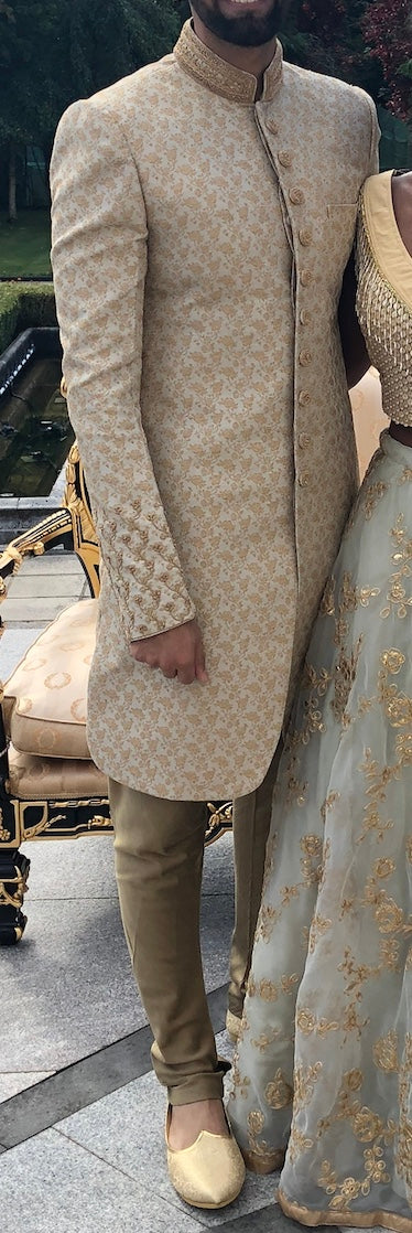 This Elegant Green Gold Embroidered Sherwani set by Mongas is perfect for a wedding or formal occasion. The medium size includes a top and trousers, making it a comprehensive outfit for the special event. The intricate embroidery and luxurious gold colour add a touch of elegance and sophistication, ideal for a stylish and dashing groom or groomsmen. Designed in the United Kingdom, this outfit exudes quality and attention to detail, making it a standout choice for any formal occasion.