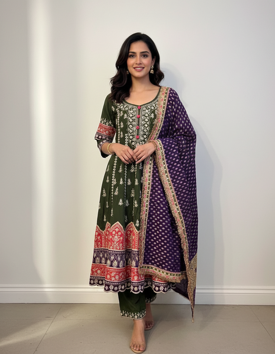 Olive Green Mehendi Outfit custom-made and hand embroidery, with hints of Purple and Pink!