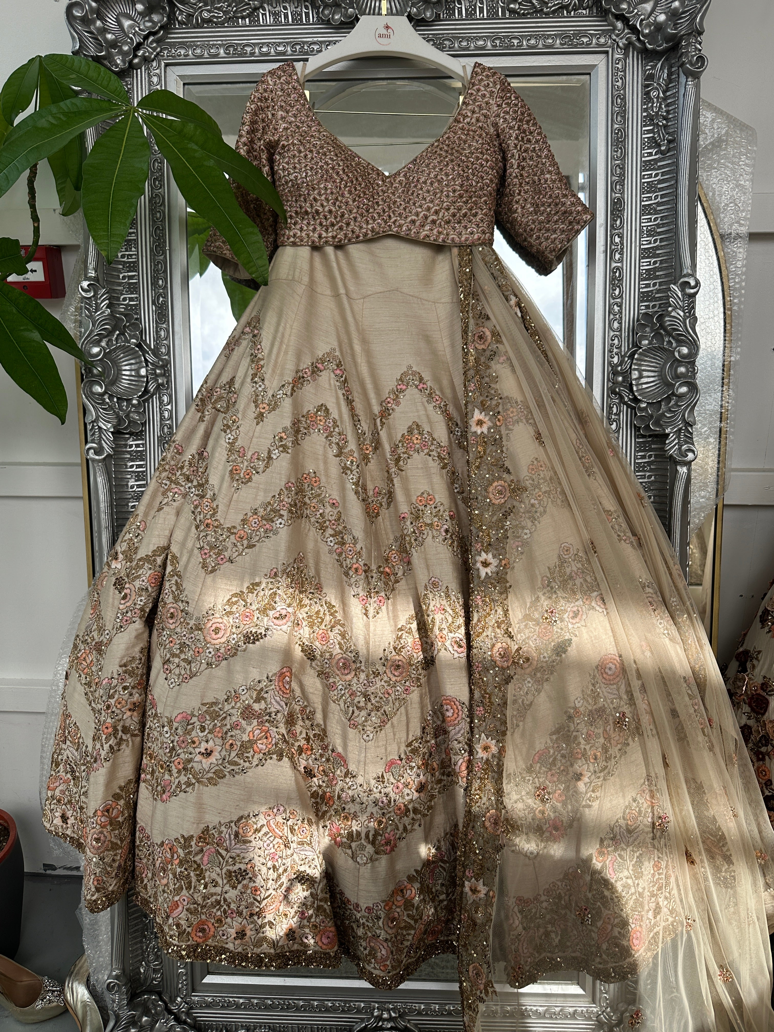Almond hand woven Silk Lehenga with heavy floral embroidery in soft pastels and antique golds from Ami Bridal Couture