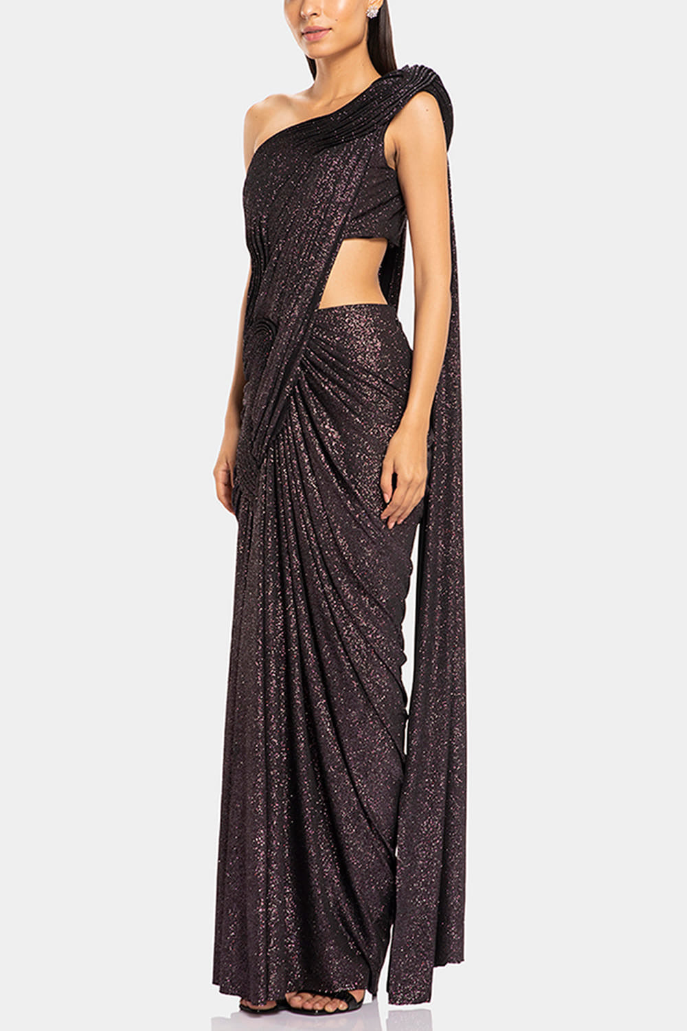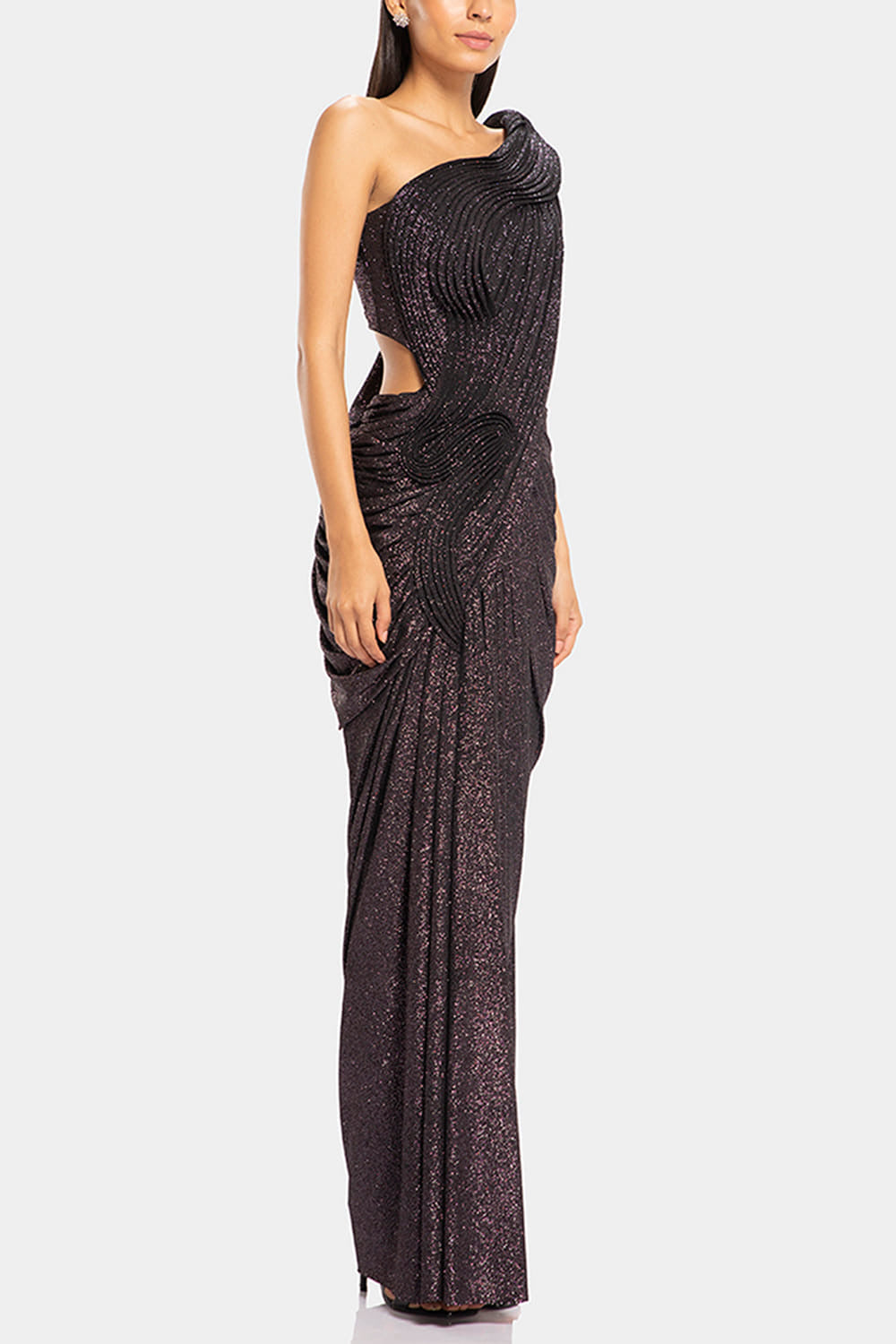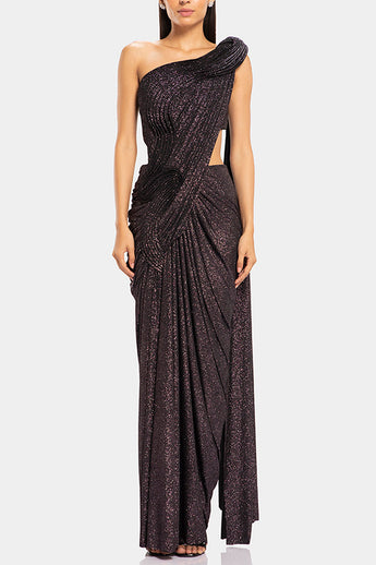 Stunning Gaurav Gupta Backless Black Gown with sleek silhouette and subtle shimmer, featuring an elegant one-shoulder drape with a dramatic open back - the perfect statement piece