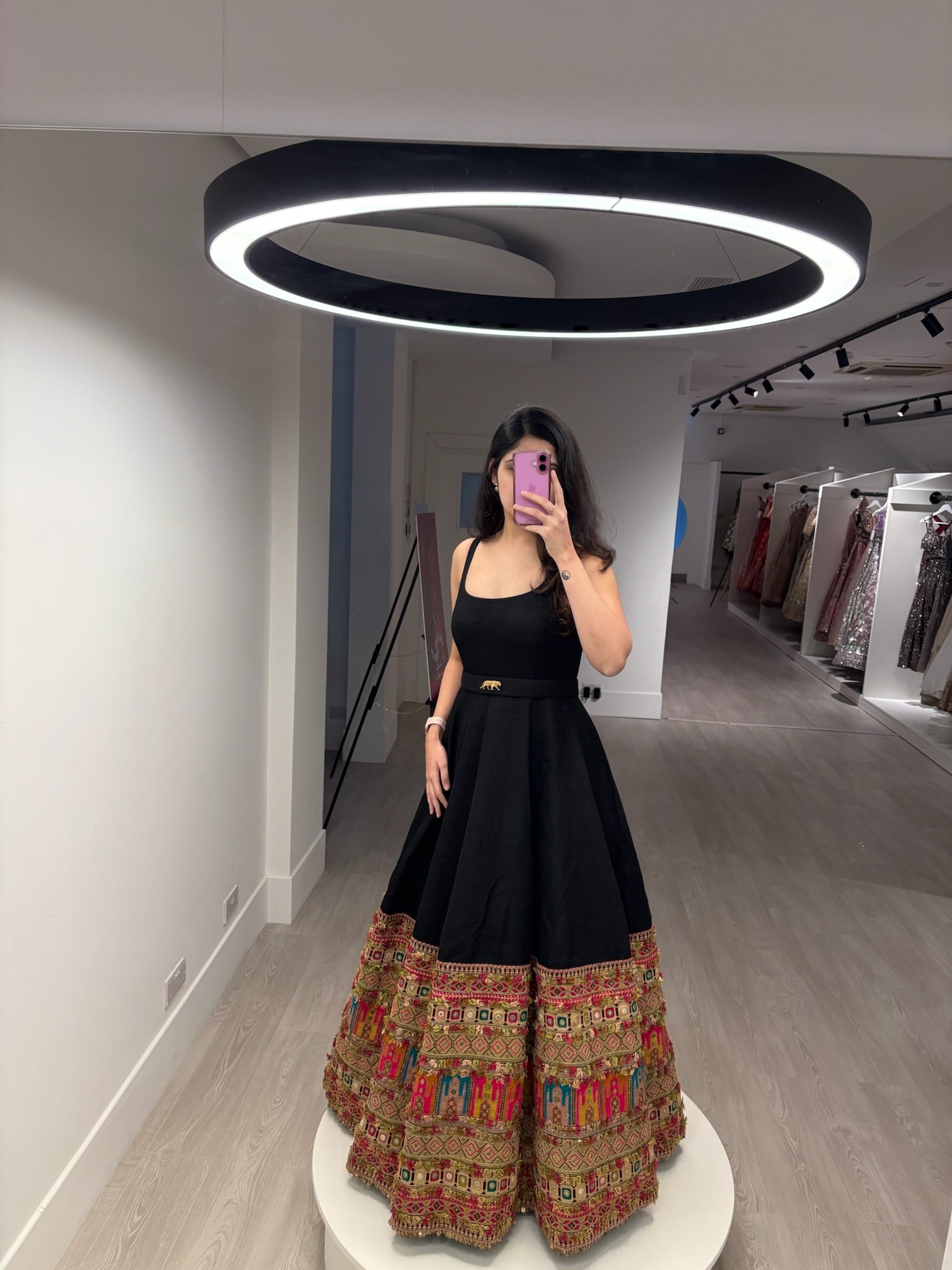 The most beautiful black Sabyasachi gown with careful embroidery and detailing in the bottom of the skirt. It is an extremely unique and flattering piece!