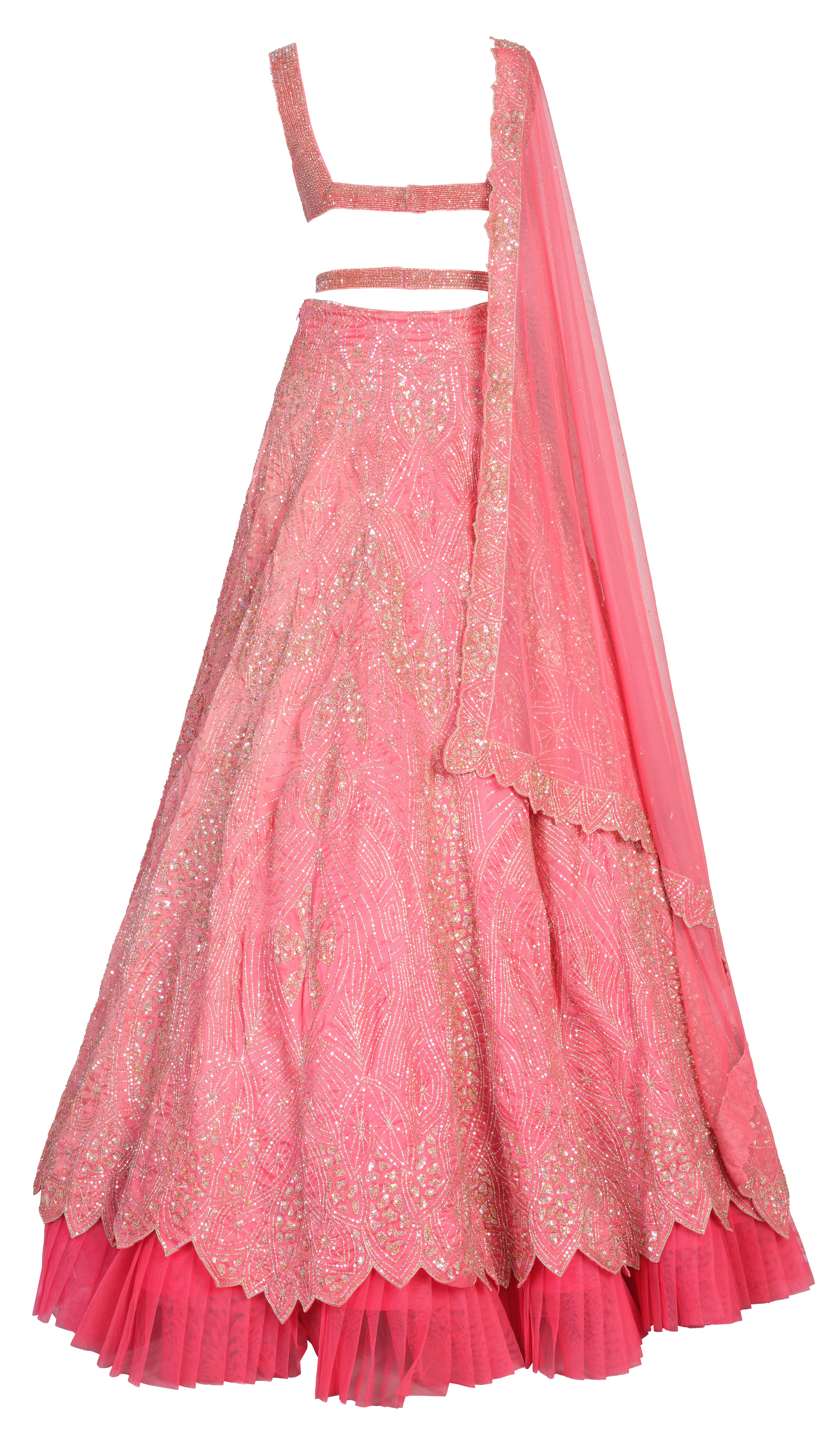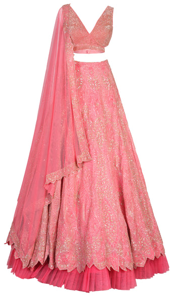 Coral Satin Organza Lehenga with silver and pale gold beading in geometric patterns from Ami Bridal Couture