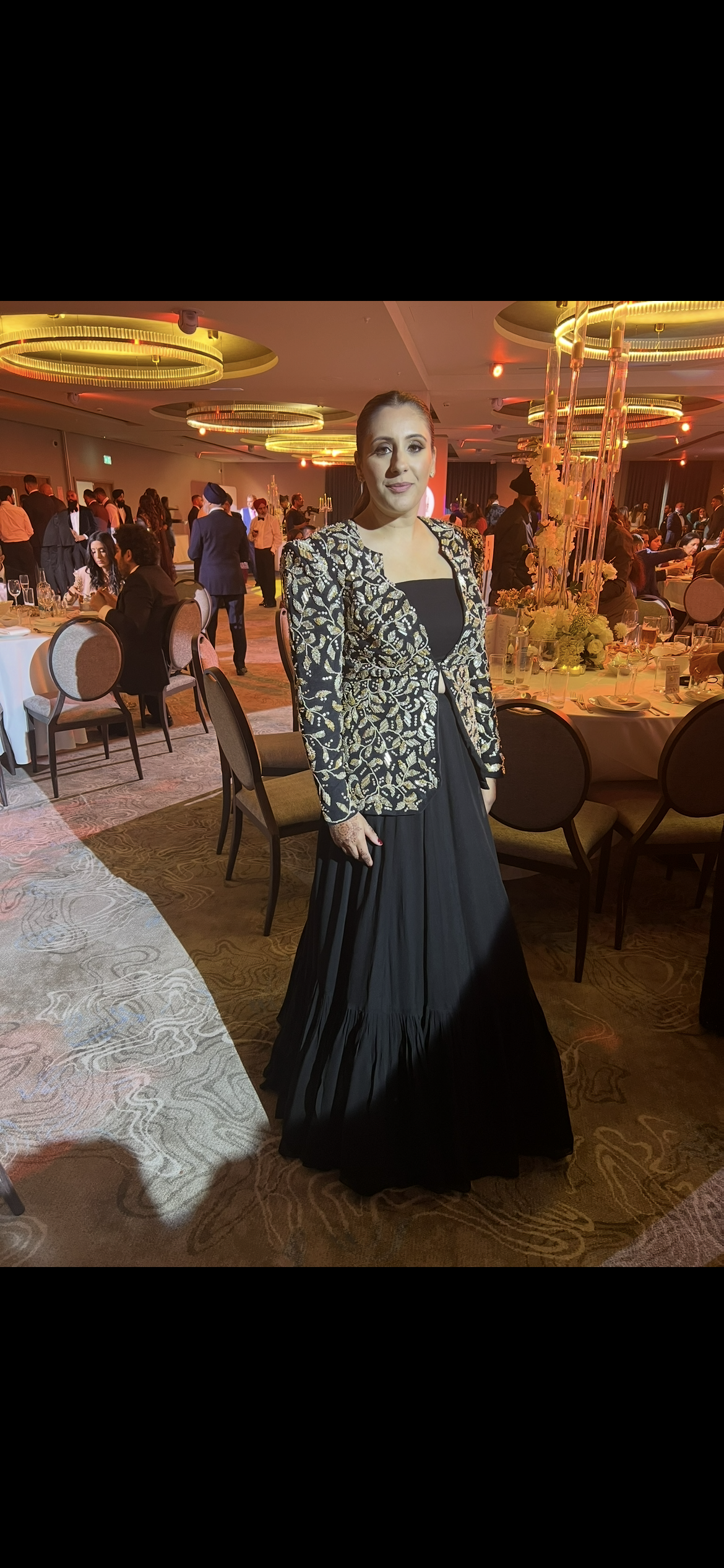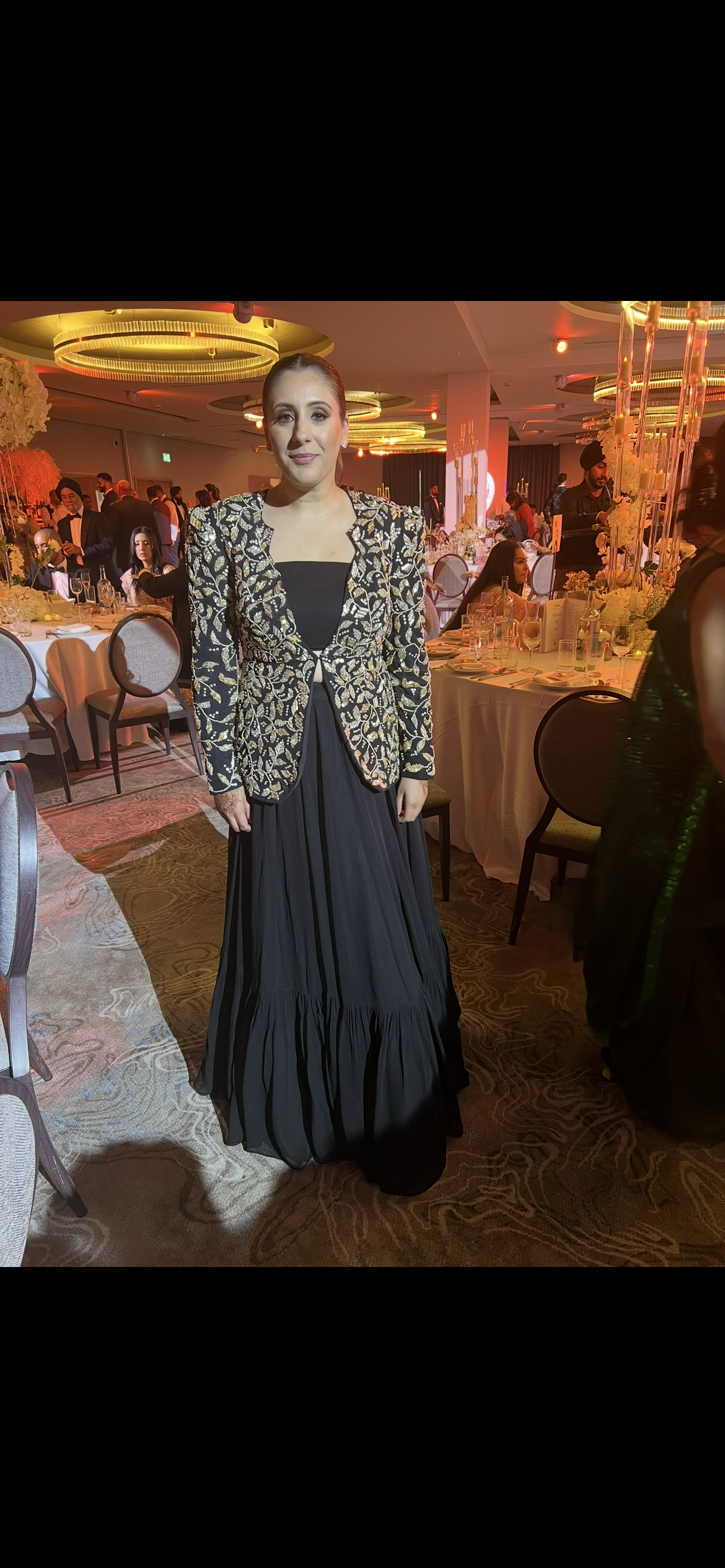 Black plunge neck blazer with powder shoulders featuring exquisite gold metal material mosaic floral hand embroidery & a georgette tiered lehenga.