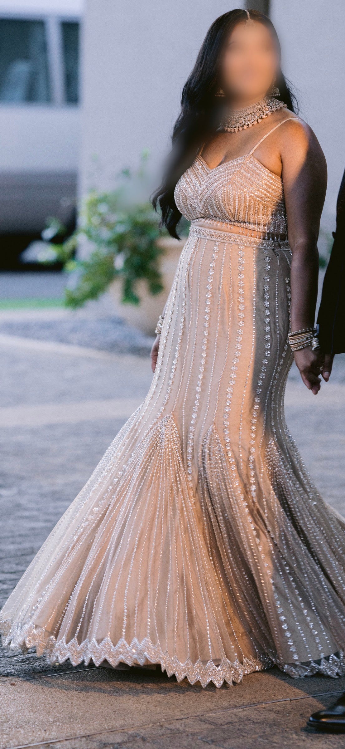 A modern, glamorous, customised Isa by Dolly Wahal piece, perfect for a reception or pre-wedding event. Flattering fishtail fit with subtle shimmer and elegant detailing. Comfortable yet statement-making. Pre-loved and ready to make someone else shine!