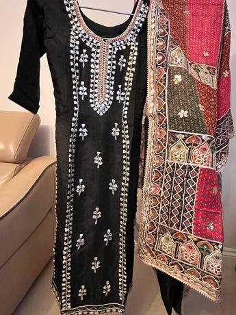 Black palazzo suit with printed multi colour dupatta (bottoms have stretch by the waist)