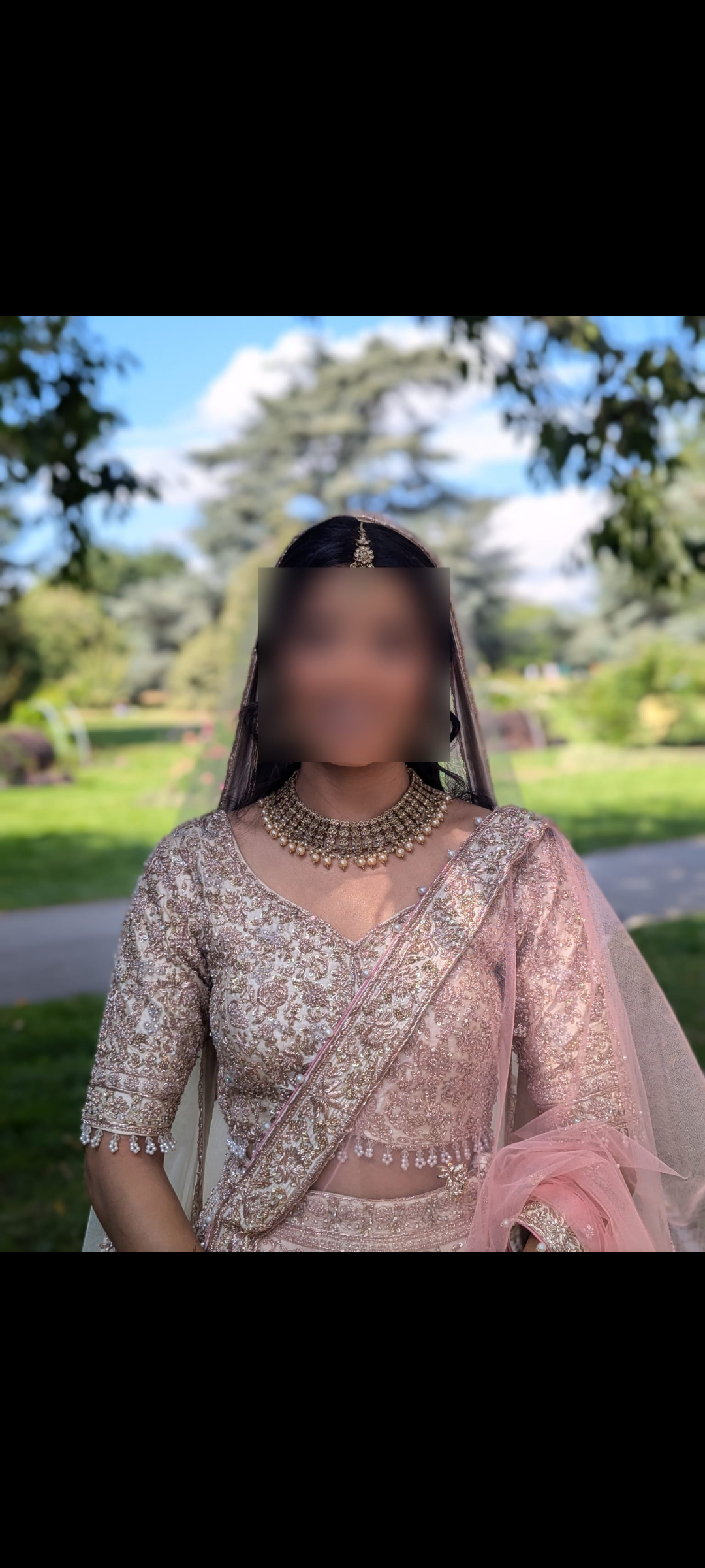 This stunning lehenga skirt is a masterpiece of design, featuring a flared A-line silhouette that offers a graceful and flattering drape. The soft, blush-toned fabric is adorned with delicate, intricate embroidery that creates a beautiful, all-over pattern. Perfect for a bridal look or any special occasion, the rich texture and sophisticated design of this lehenga make it a truly show-stopping piece. The voluminous skirt creates a majestic presence, ensuring you feel like royalty on your most memorable day.