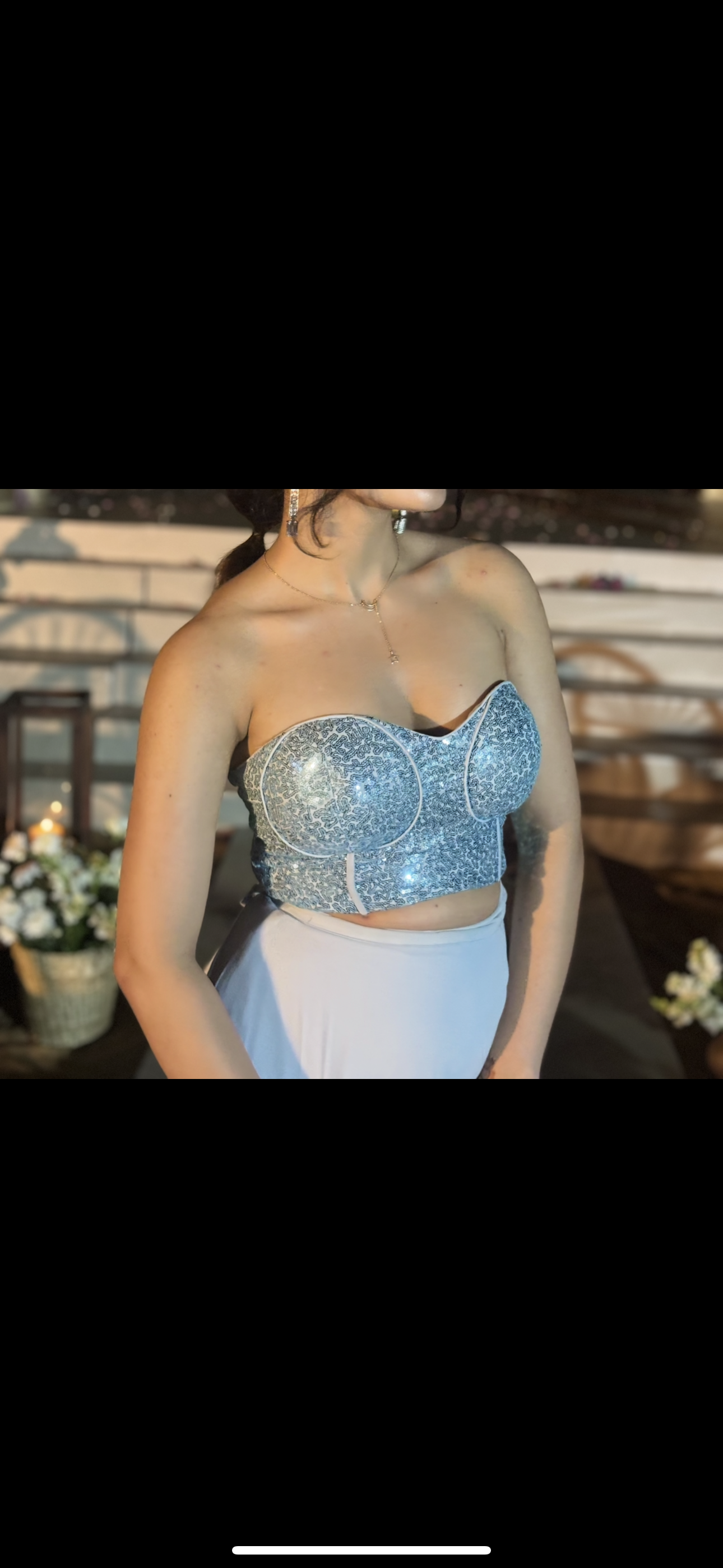 The perfect light blue lehenga for a cocktail/western look! The sleeves have been detached (see last picture for reference) but can be re-attached.