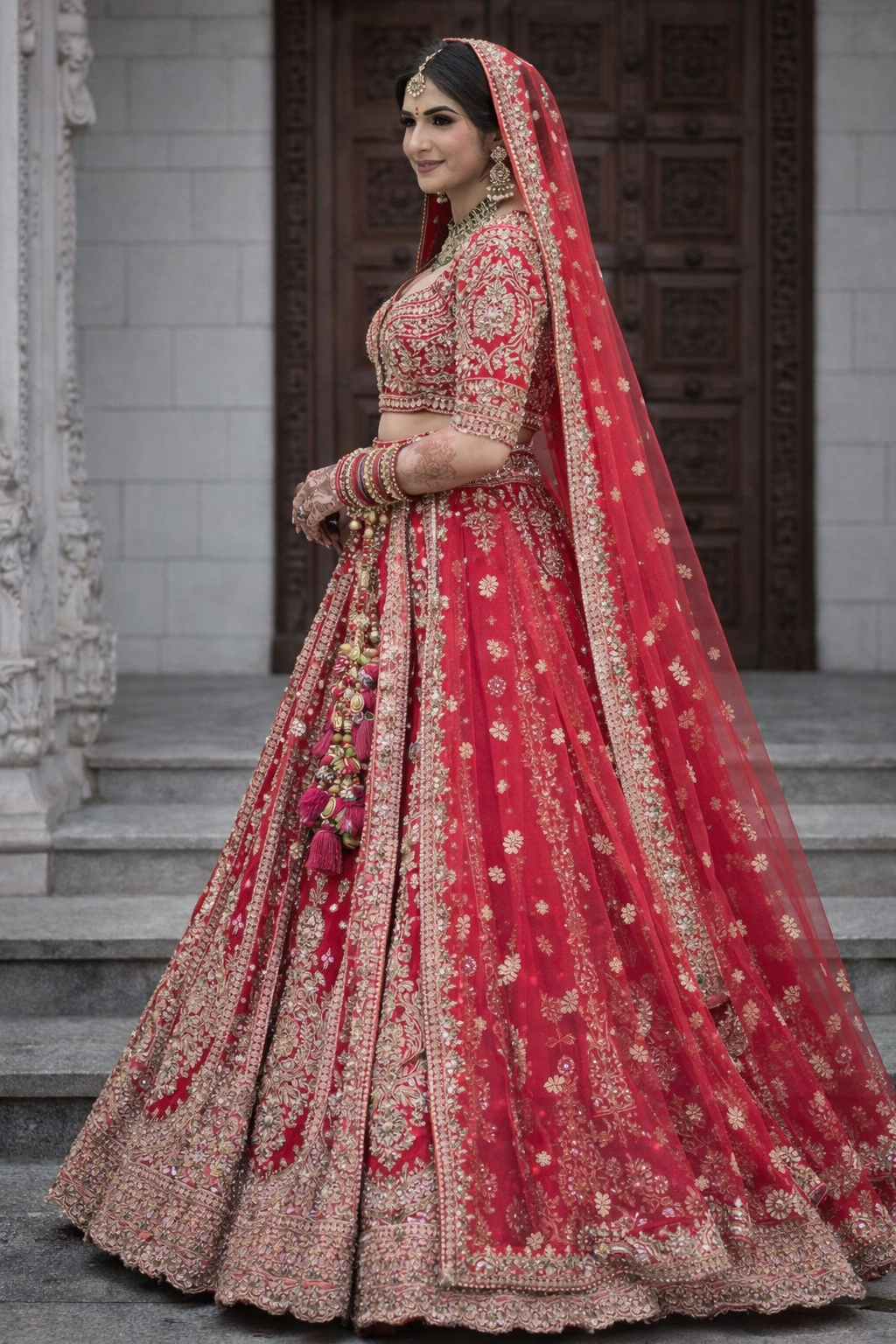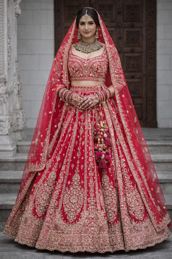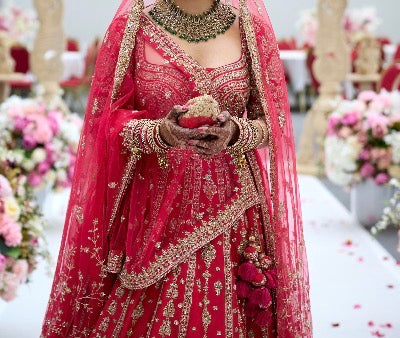 This vibrant redish pink bridal lehenga features rich gold zari embroidery with intricate traditional motifs that cascade beautifully across the skirt and bodice. The structured blouse with ornate sleeves is paired with a sheer red dupatta adorned with delicate gold detailing and tassel accents. Timeless and regal, the ensemble captures classic bridal elegance with luxurious craftsmanship.