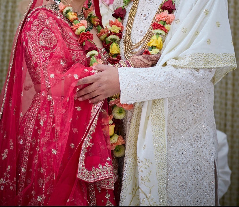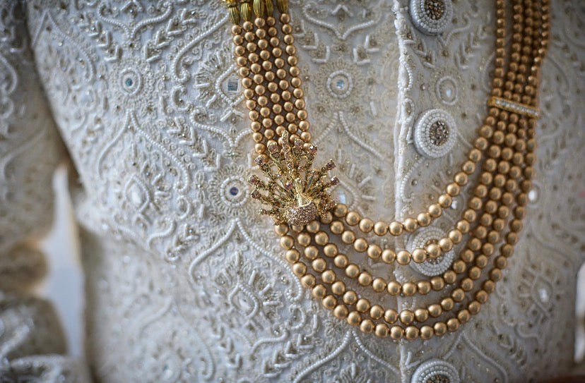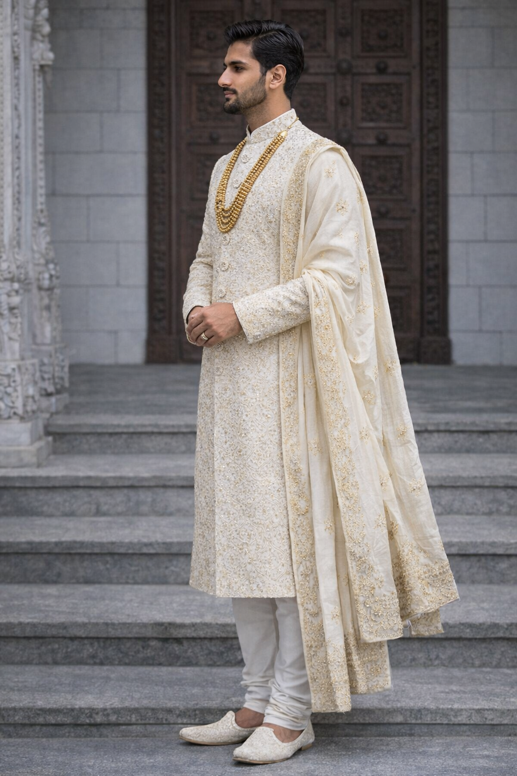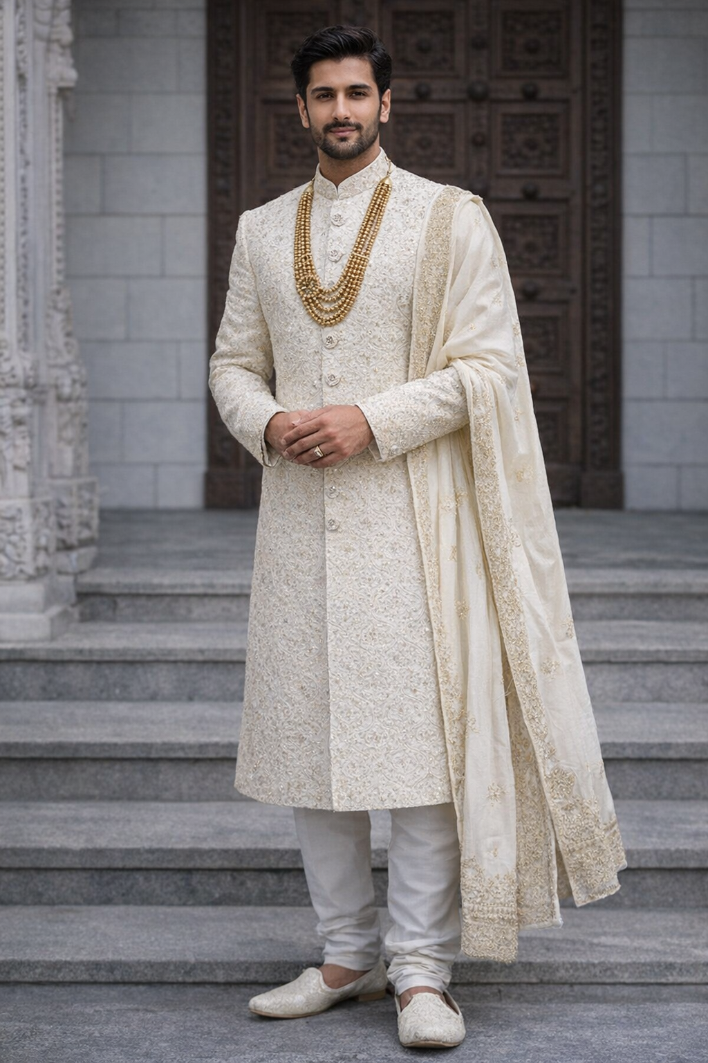 This elegant ivory sherwani features intricate tonal embroidery with delicate thread and sequin work, creating a refined and regal texture. Paired with layered gold mala necklaces and classic churidar trousers, the ensemble exudes timeless royal sophistication perfect for a groom’s wedding look.