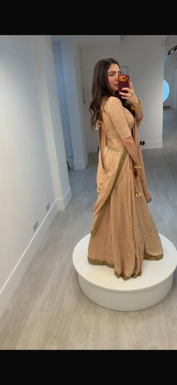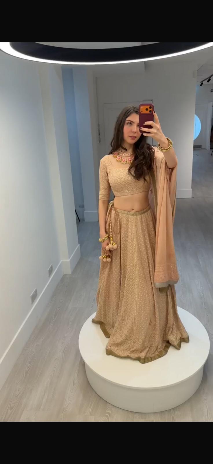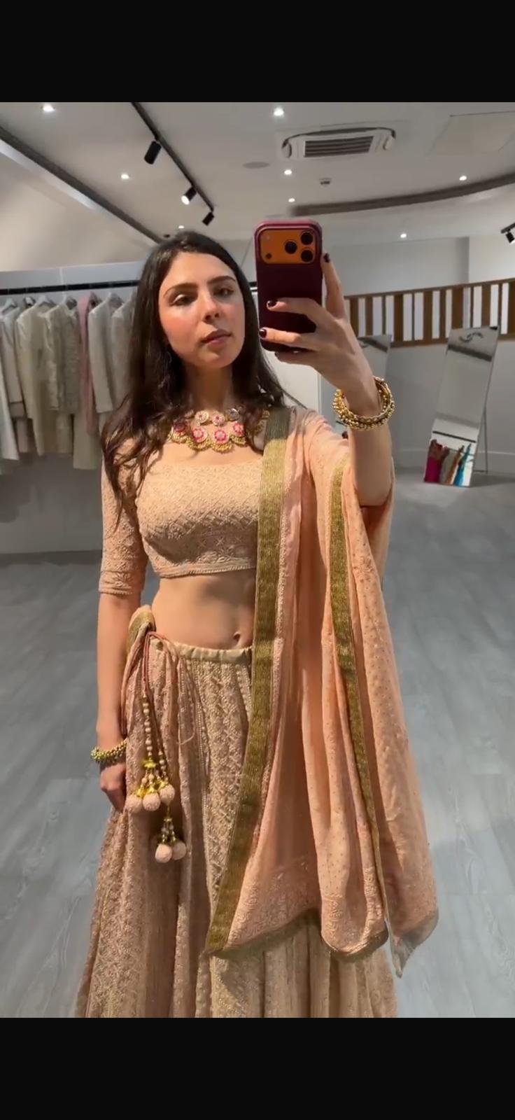 This outfit features a soft peach-beige lehenga set with delicate all-over embroidery, paired with a fitted half-sleeve blouse that has an elegant open-back tie detail. The look is completed with a lightweight dupatta with a muted gold border and traditional latkan tassels, giving it a graceful, festive and understated charm.
