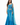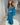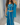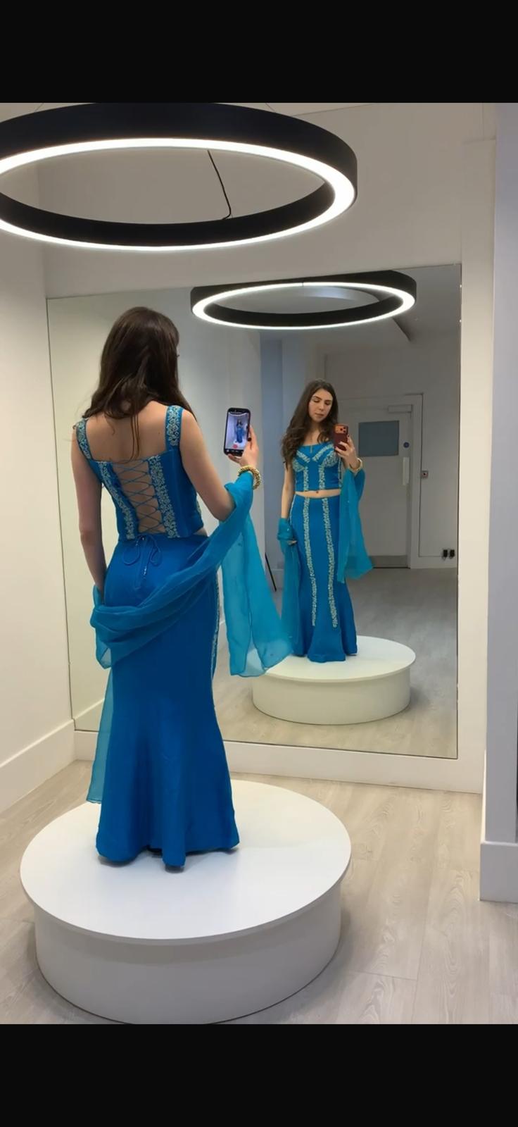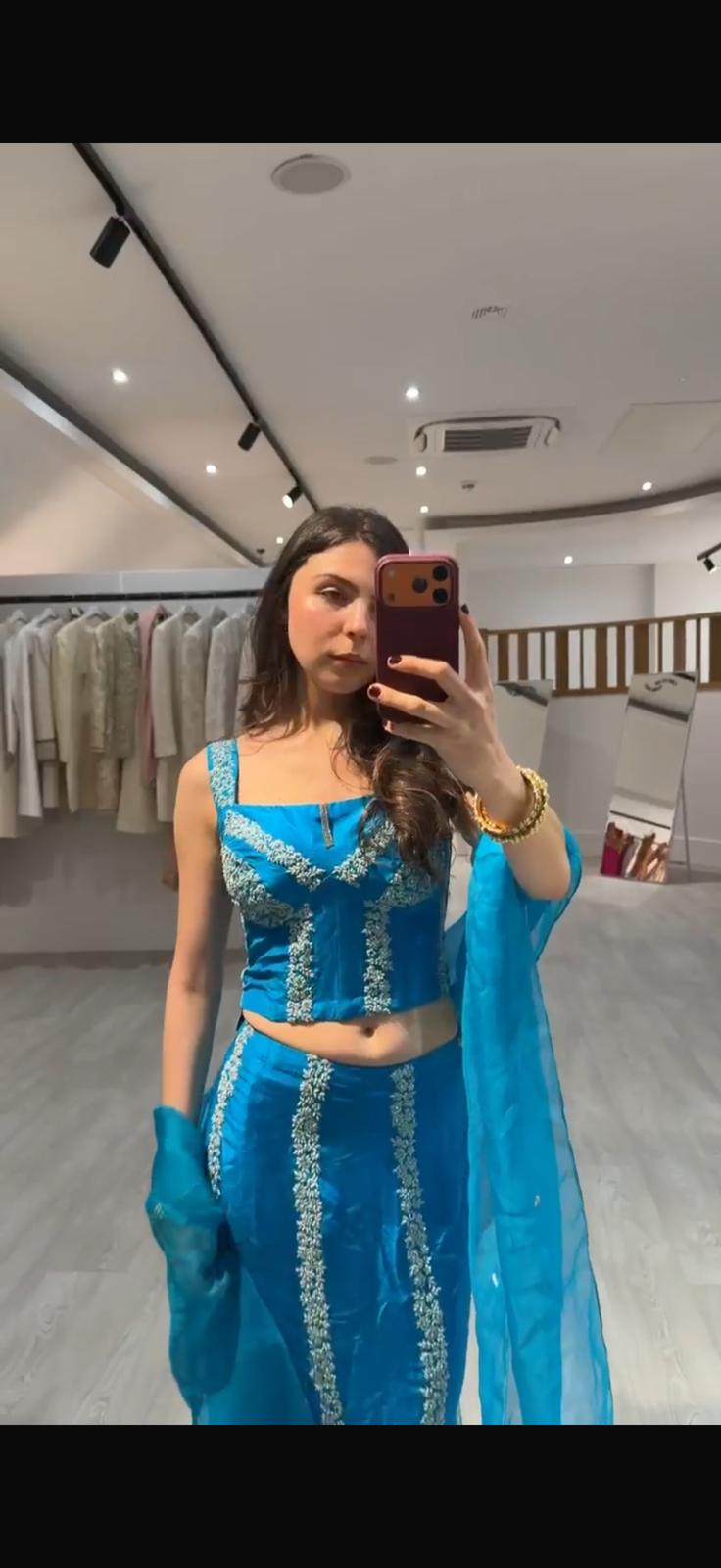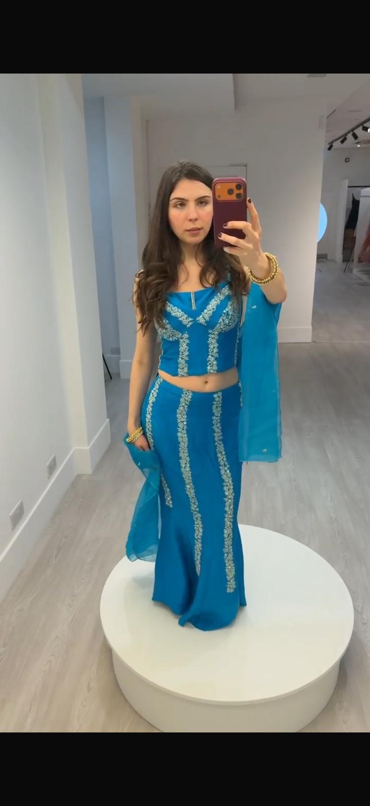 A vibrant turquoise blue two-piece lehenga set featuring a structured sleeveless blouse with delicate silver-white floral embroidery and a flattering fitted silhouette.