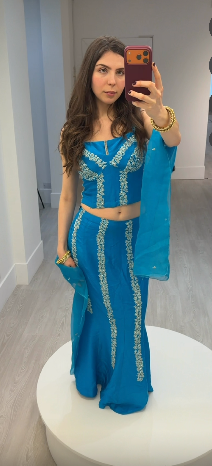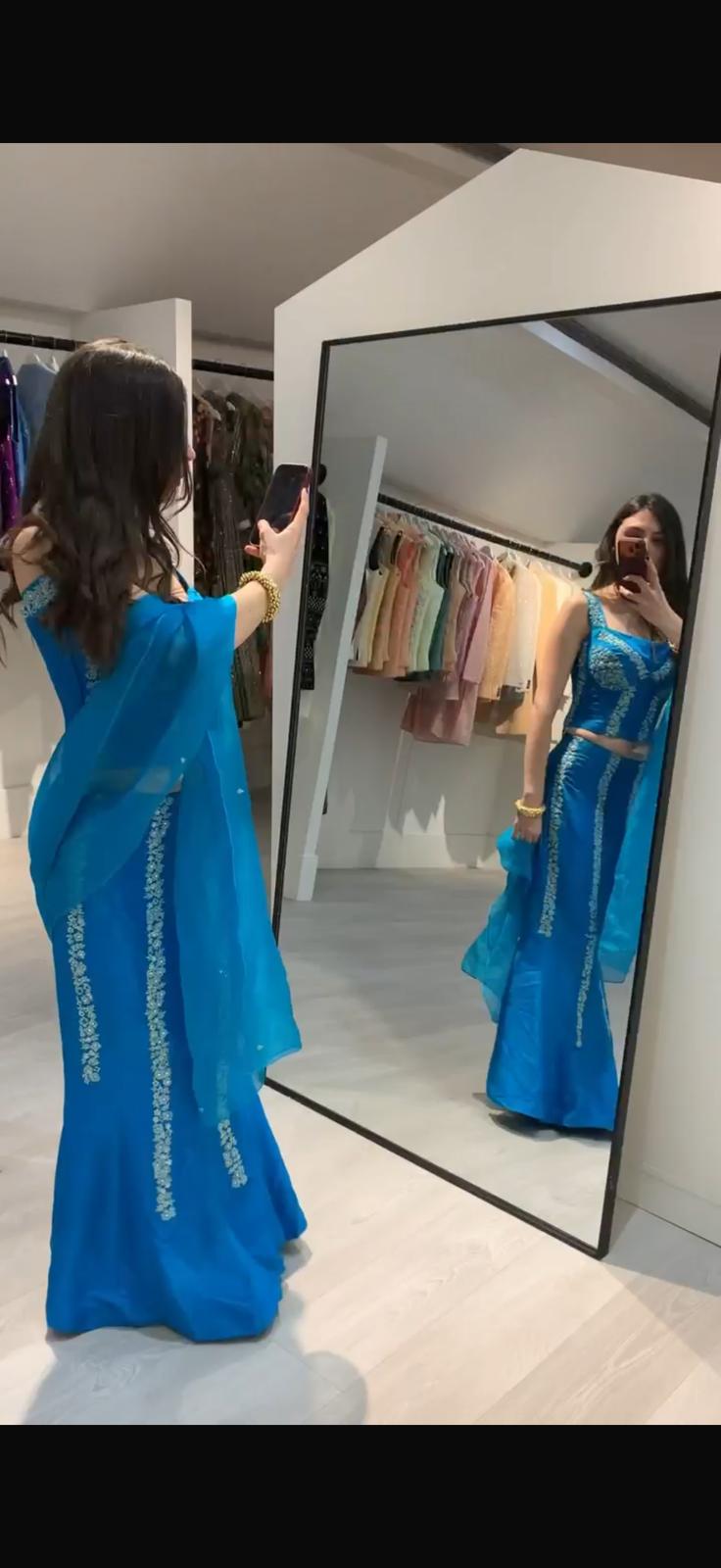 The fish-cut skirt enhances the curves with subtle flare at the hem, paired with a sheer matching dupatta for an elegant, contemporary occasion look.