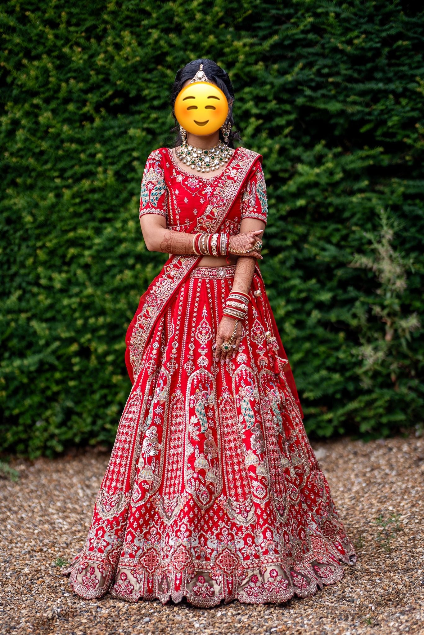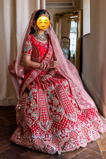 This beautiful red bridal lehenga has delicately embroidered peacocks and elephants on the blouse and lehenga, and comes with the beautiful embroidery bordered matching dupatta.