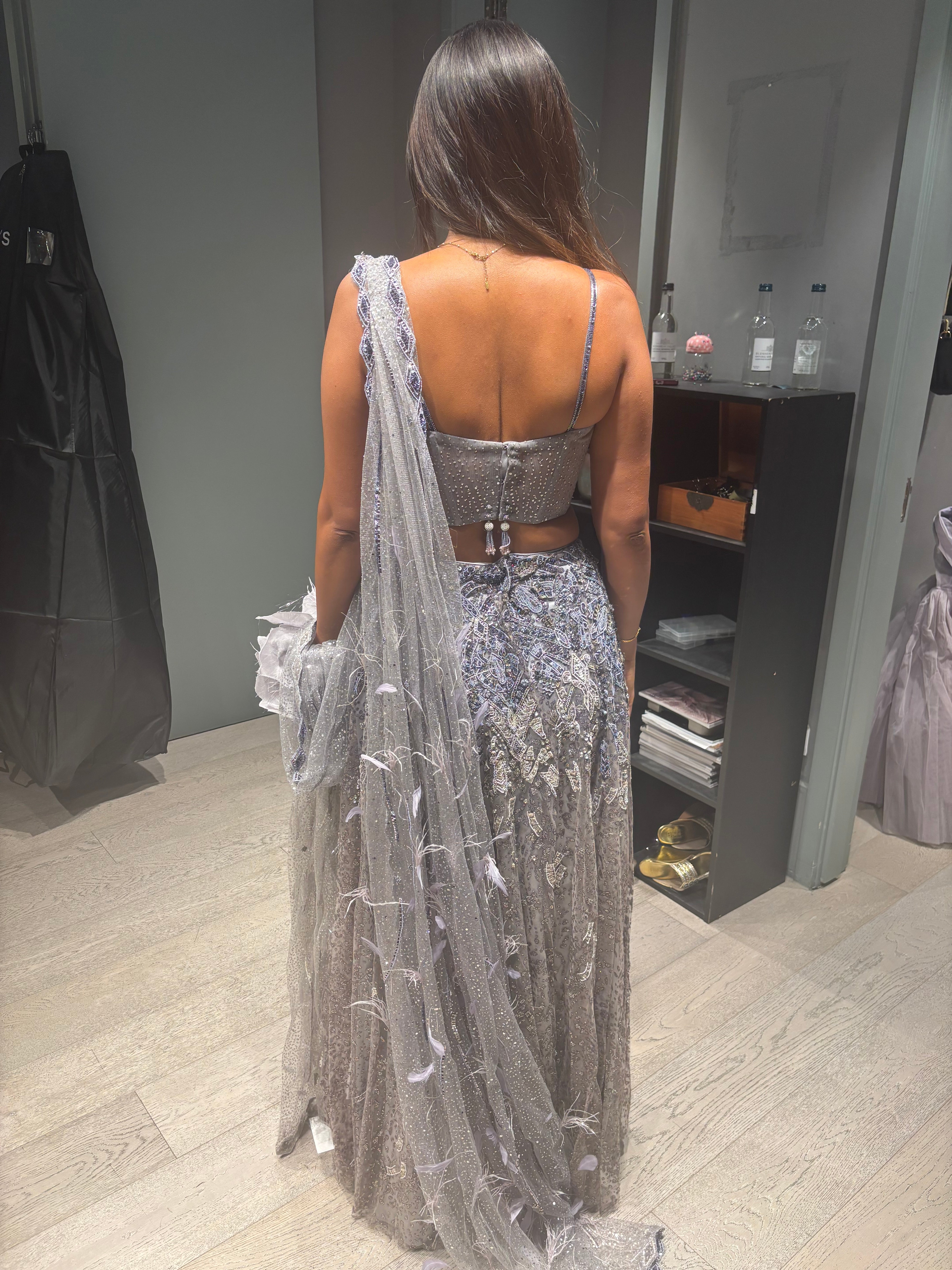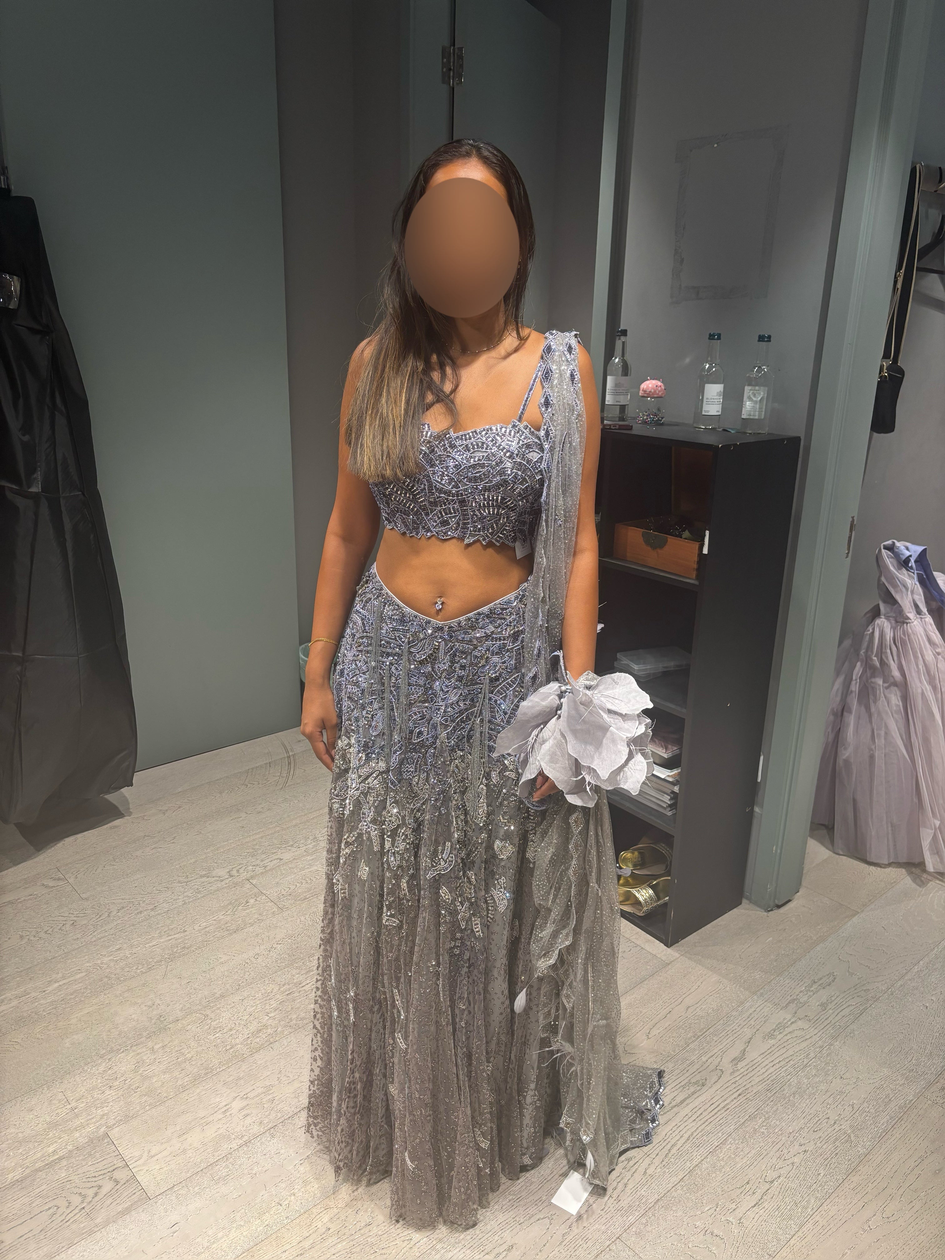 Introducing the Jemma, a stunning silver and lilac lengha that epitomises contemporary elegance. This exquisite piece from Dolly J combines traditional craftsmanship with modern design sensibilities, featuring a harmonious blend of lustrous silver embellishments against a rich lilac backdrop. The lengha silhouette flatters the figure whilst allowing graceful movement, making it an ideal choice for weddings, celebrations, and special occasions. Crafted with meticulous attention to detail, this ensemble showcases the designer's signature sophistication and refined aesthetic.