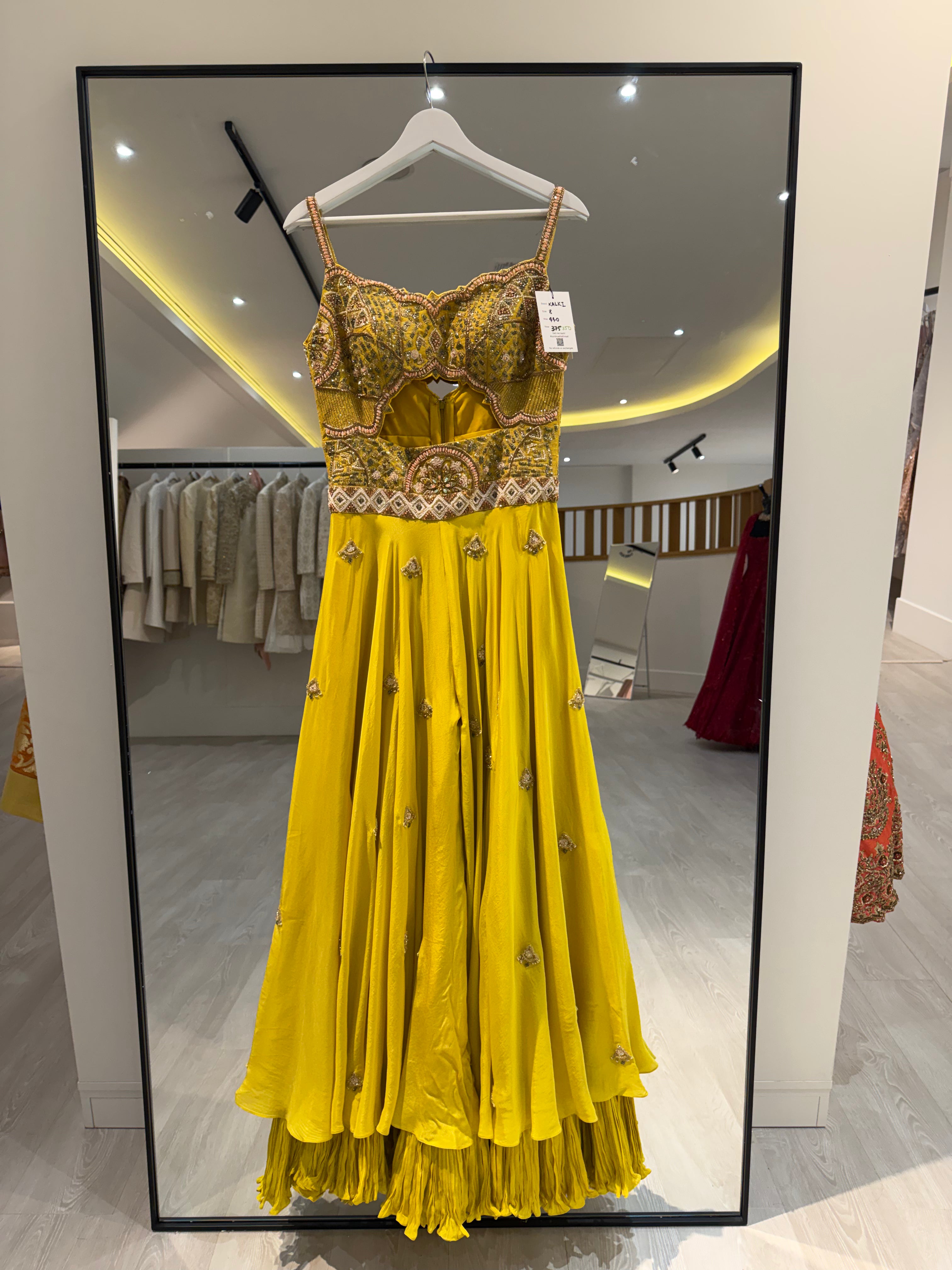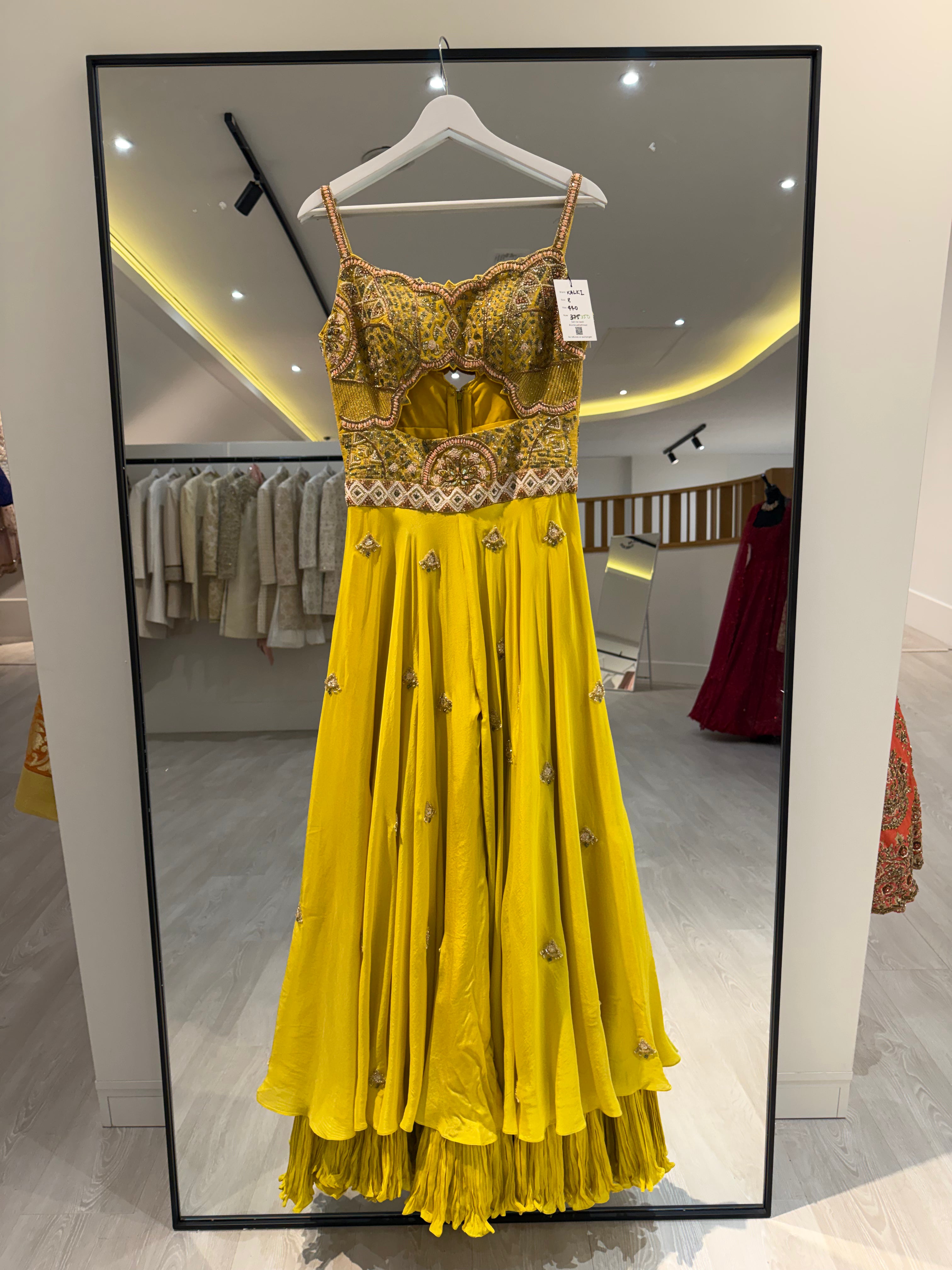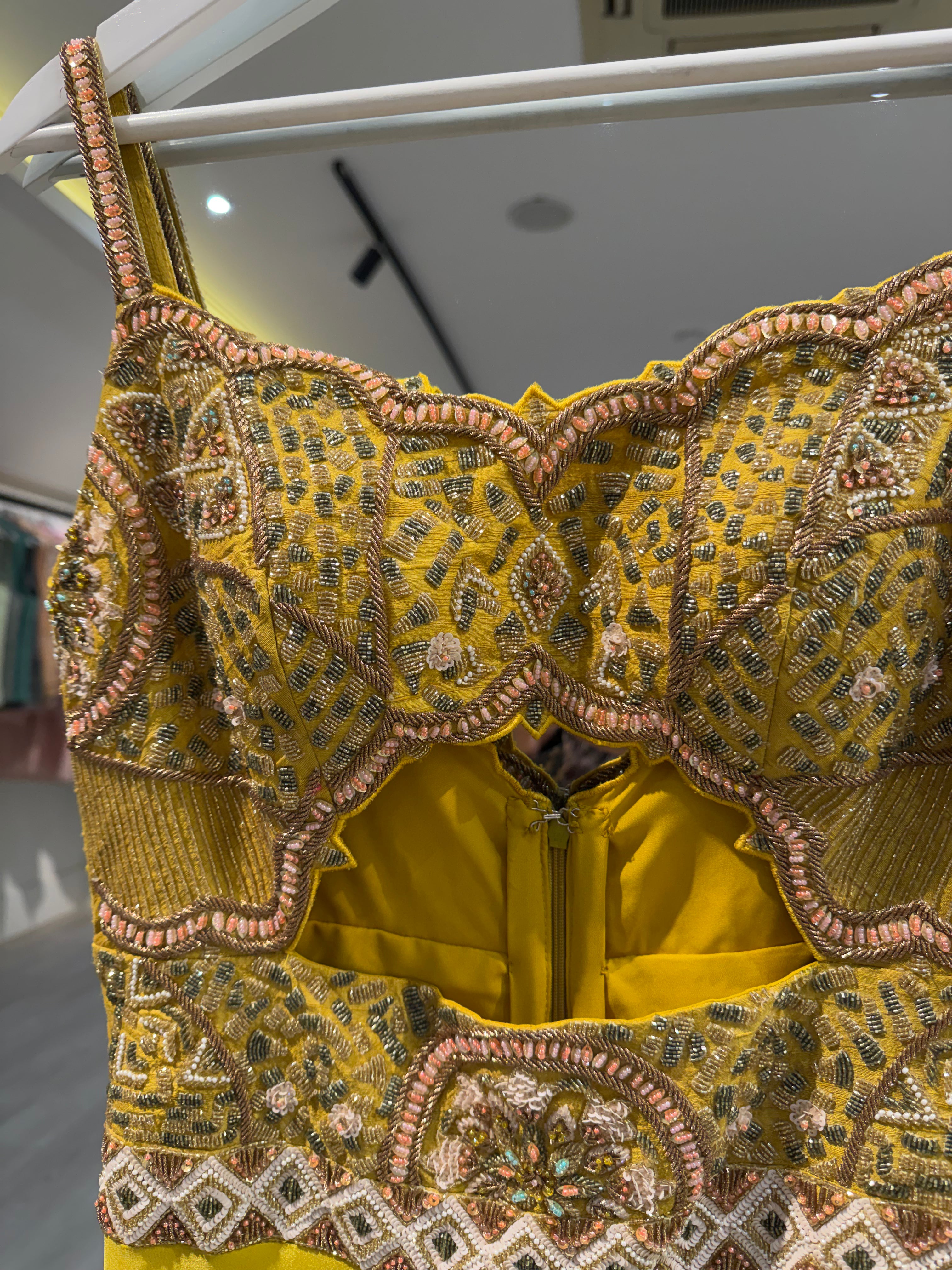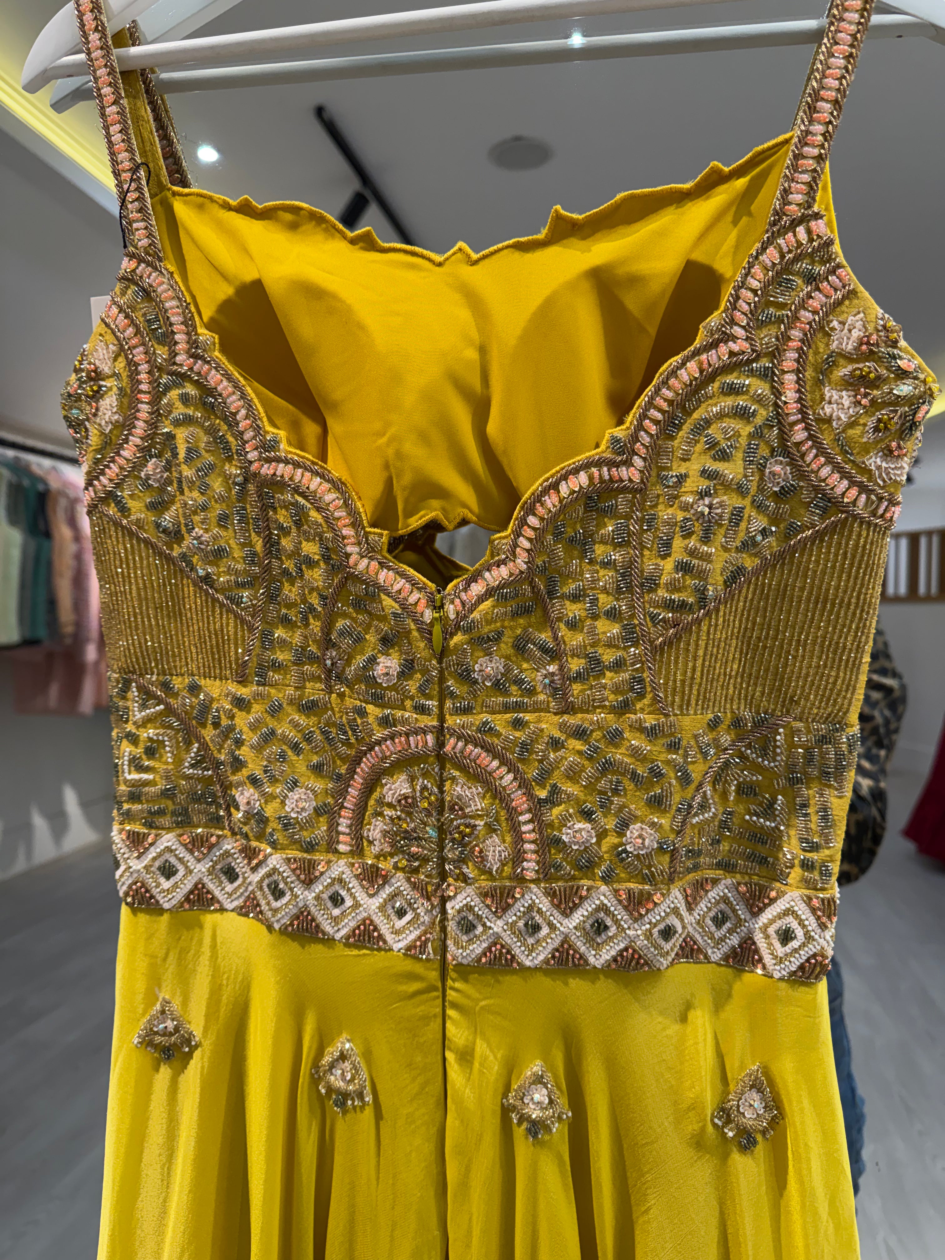 This beautiful yellow Kalki jumpsuit featuring an embroidered bust - bust area would fit an A-C cup. Perfect for any event, including Destination Weddings, Sangeets, Mehndi's, welcome parties and much more!