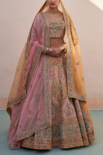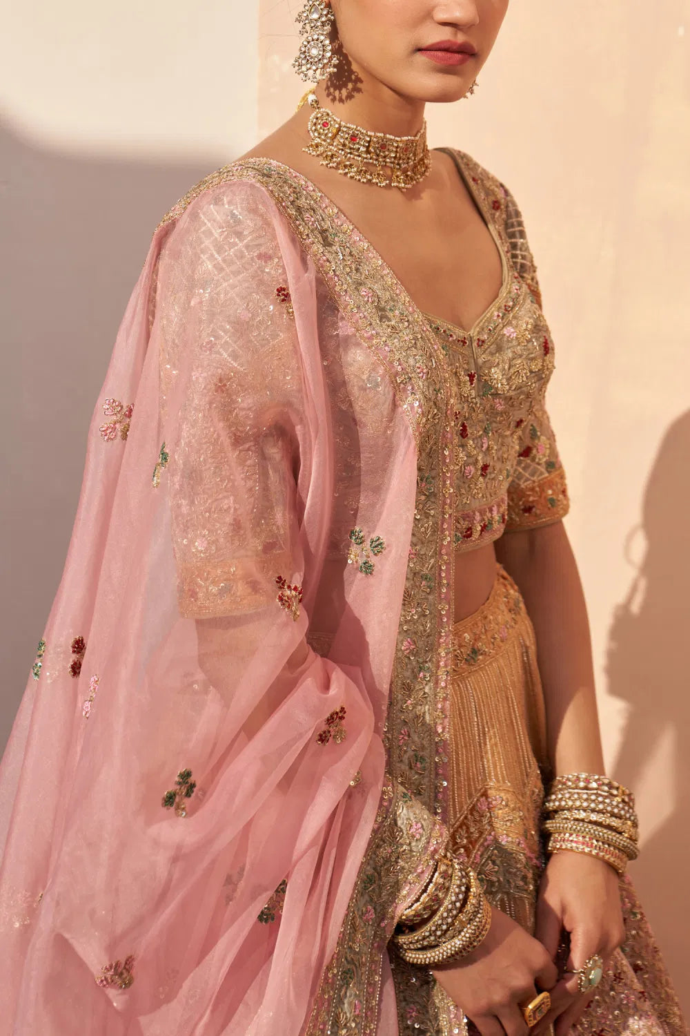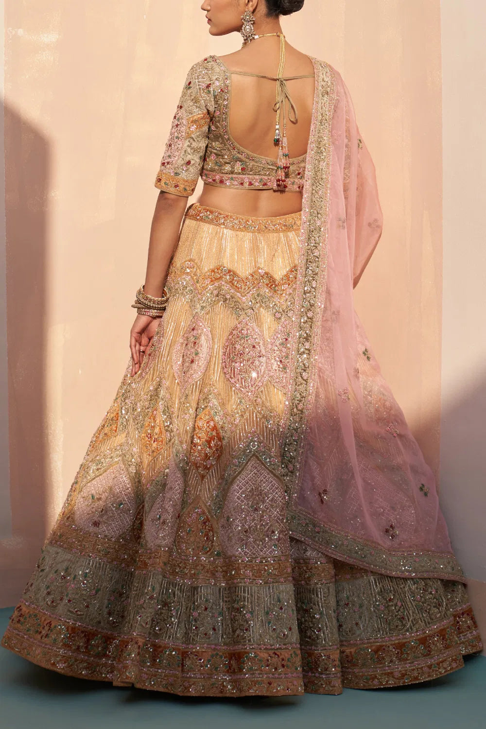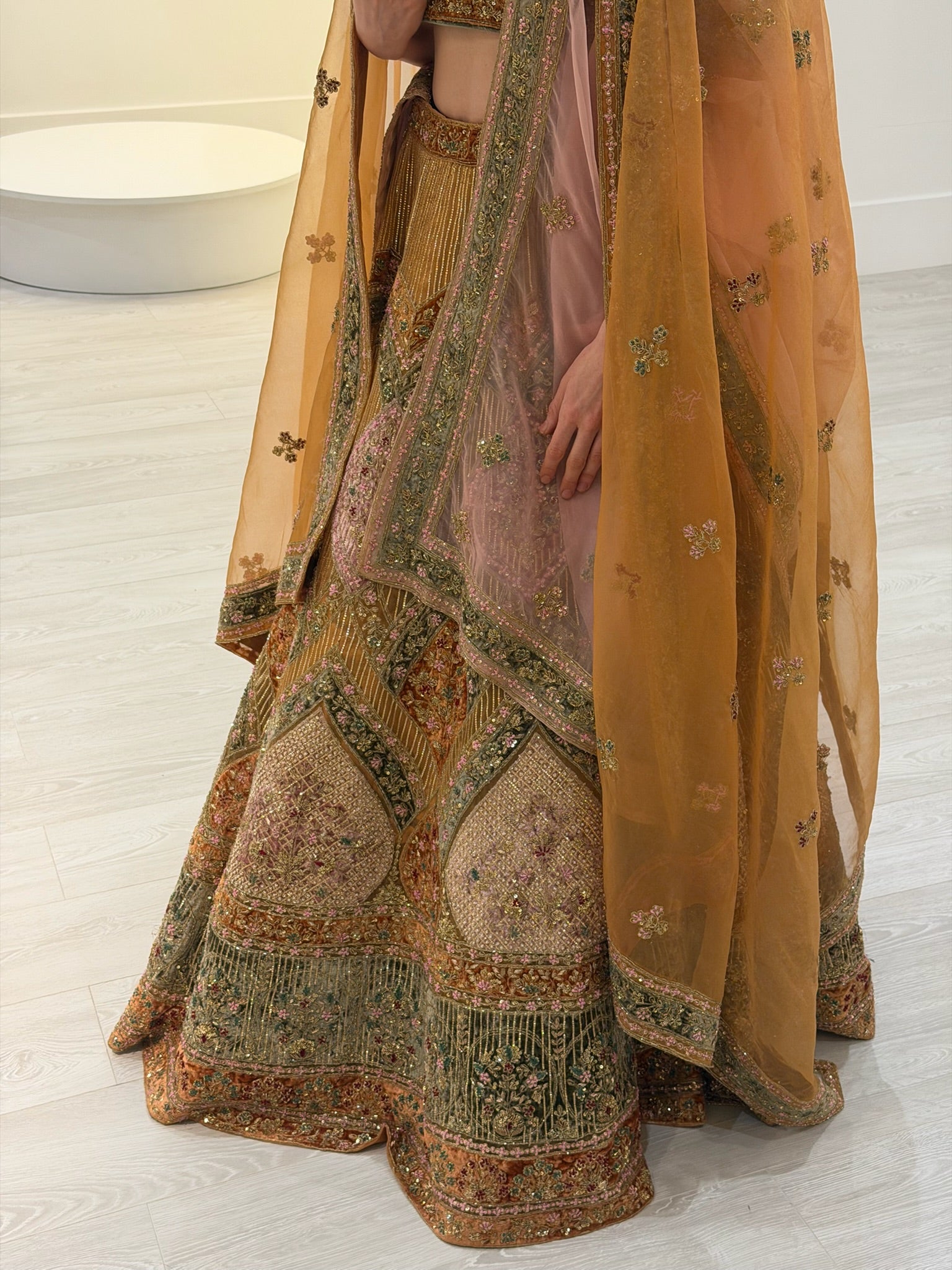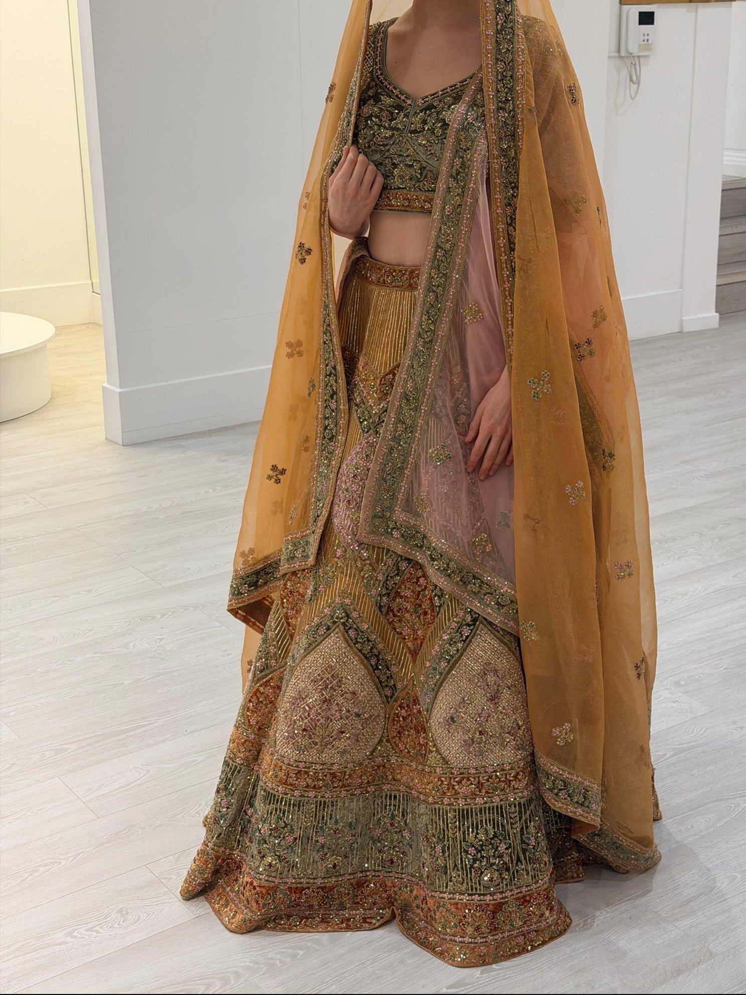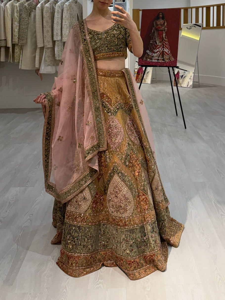 Green, gold, and orange Angad Singh elegant and enchanting bridal lehenga, with embroidery detailing in multiple hues, complementing the look with a matching blouse and embroidered dupatta. (Please, refer to the last 4 pictures to see the real colour way)
