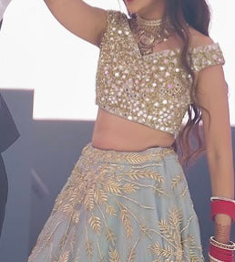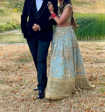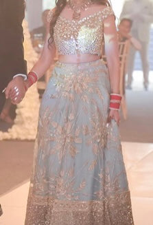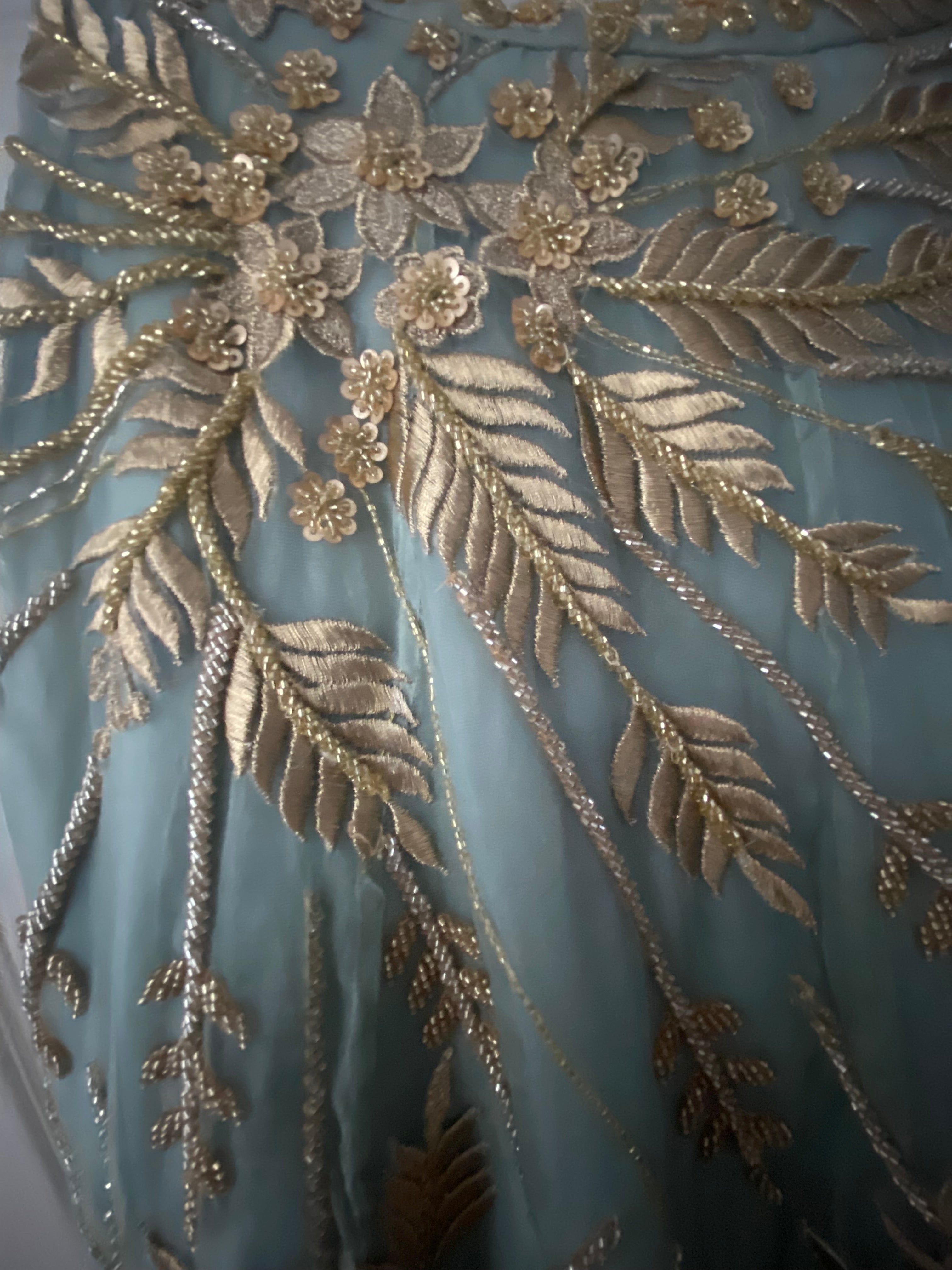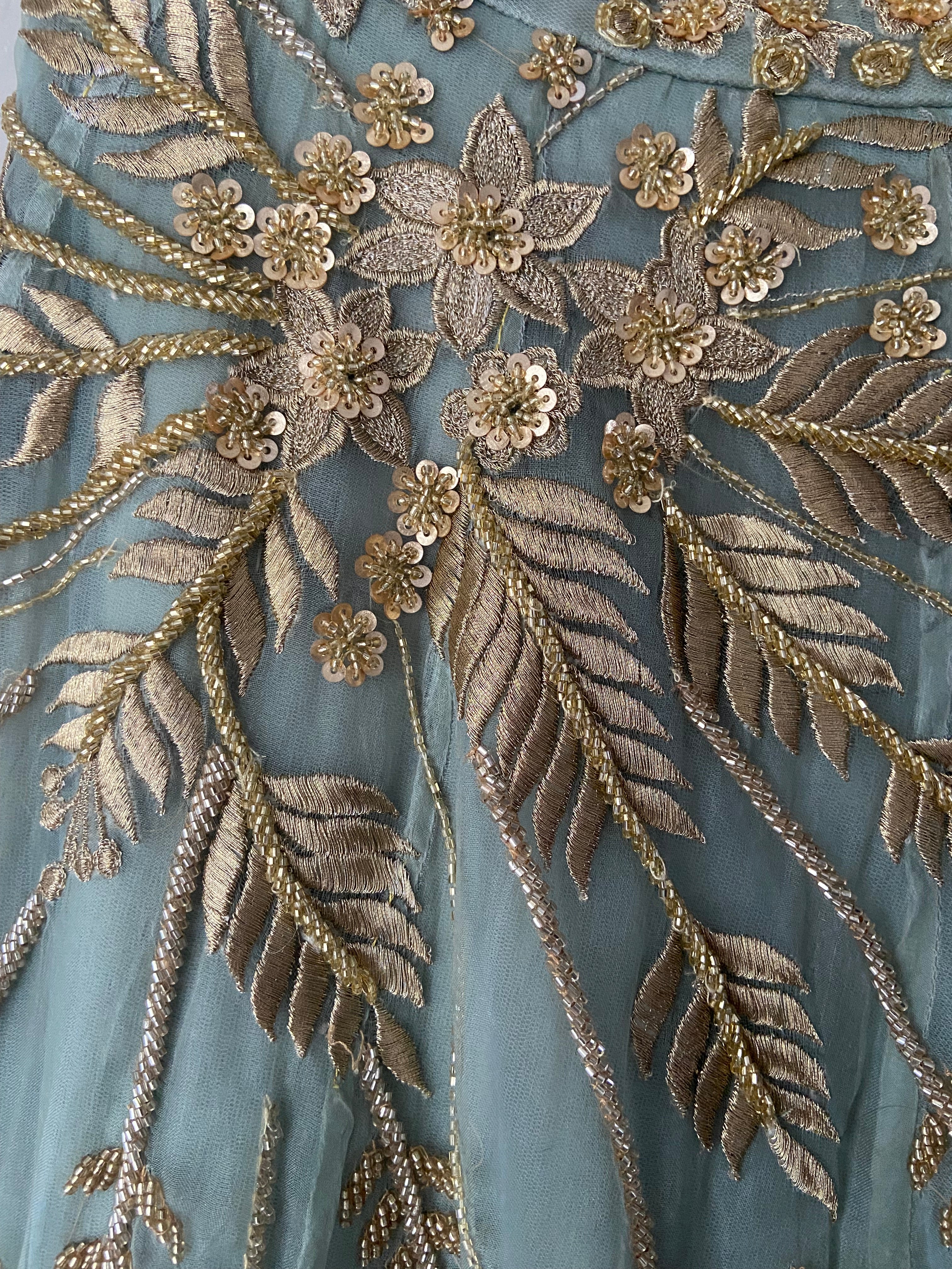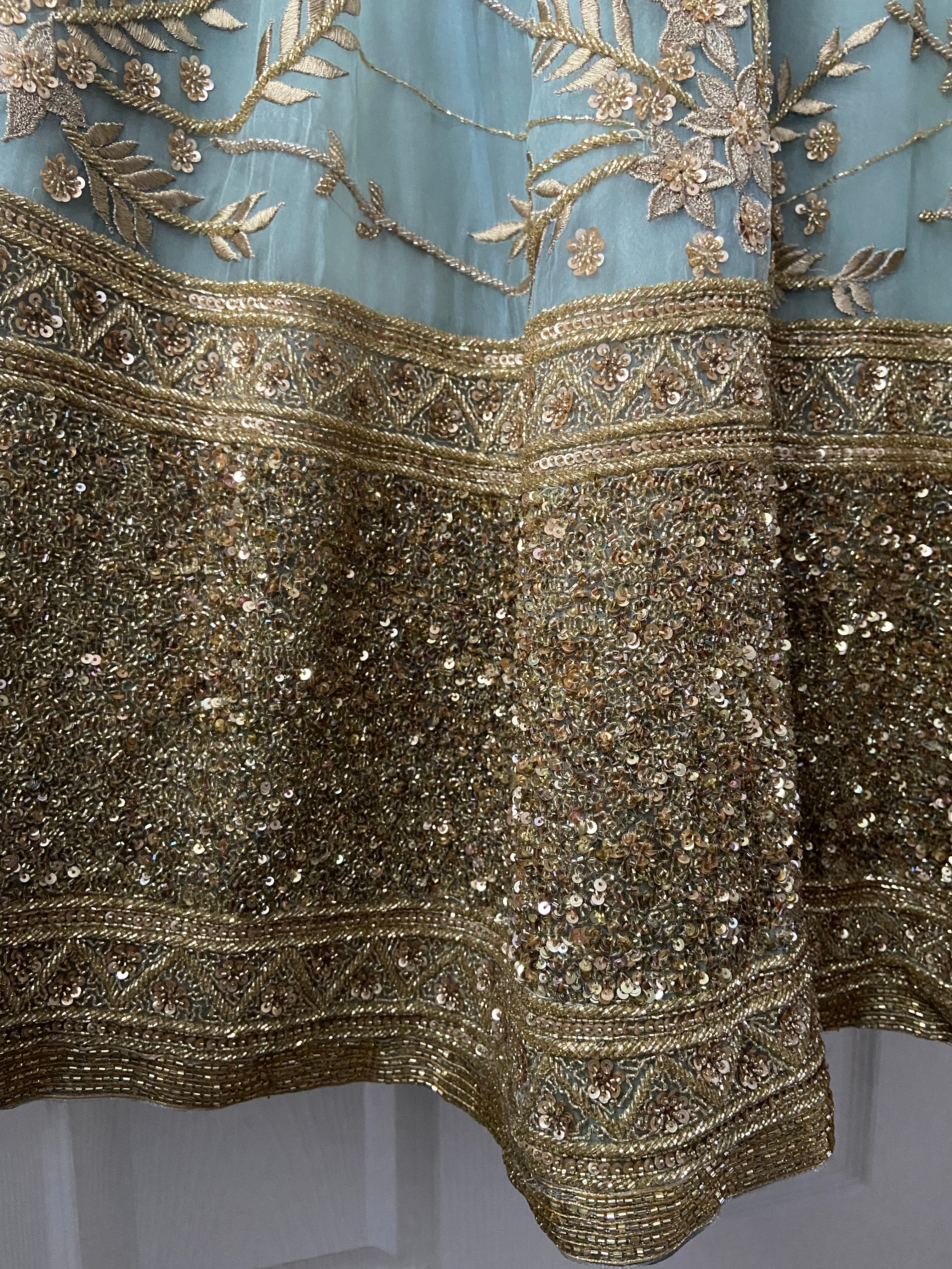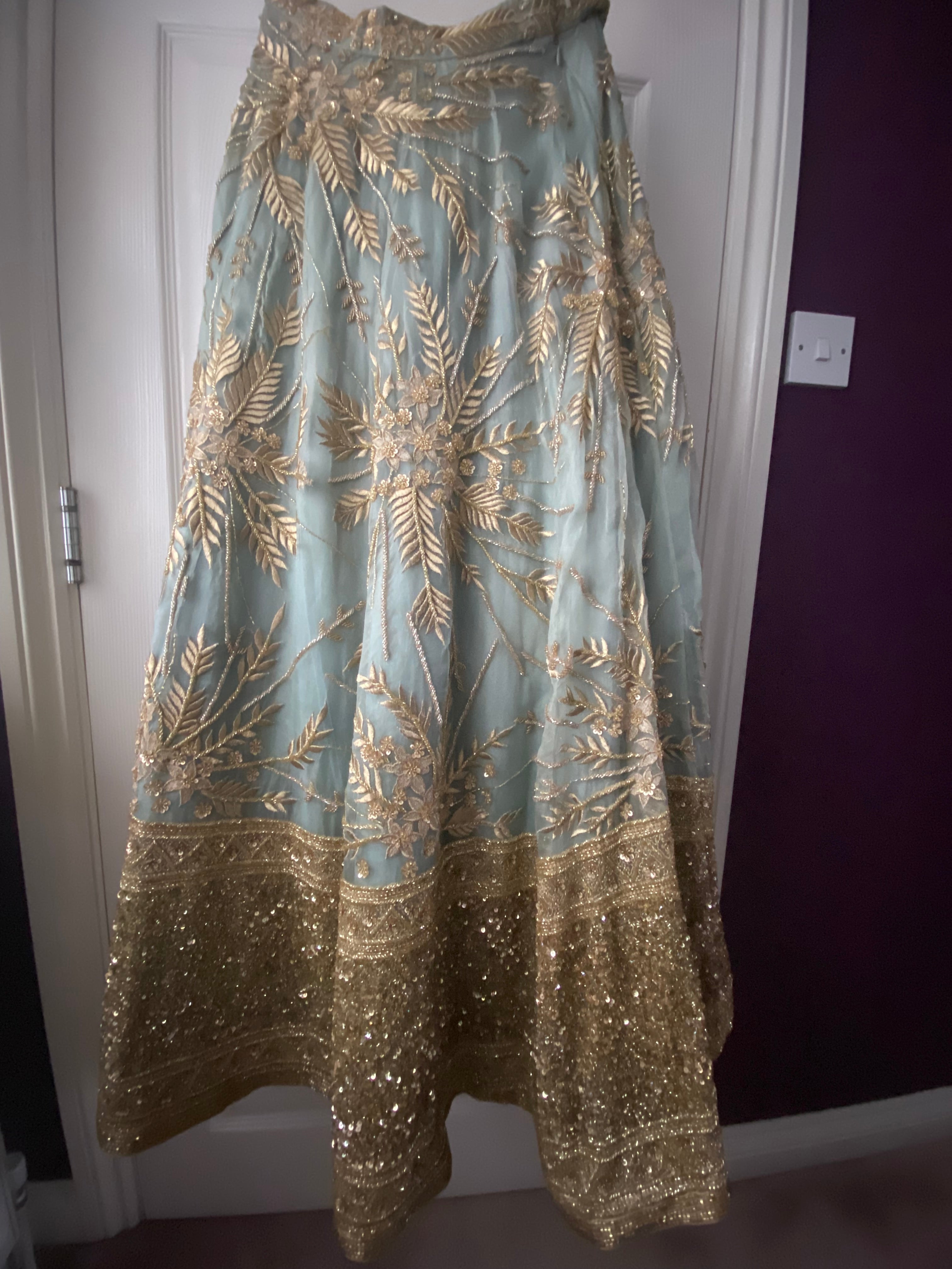 Gorgeous hand embroidered lehenga skirt with gold sequin and thread-work pattern. Perfect for any occasion- engagement, wedding or party whether it’s your own event or you’re a guest.