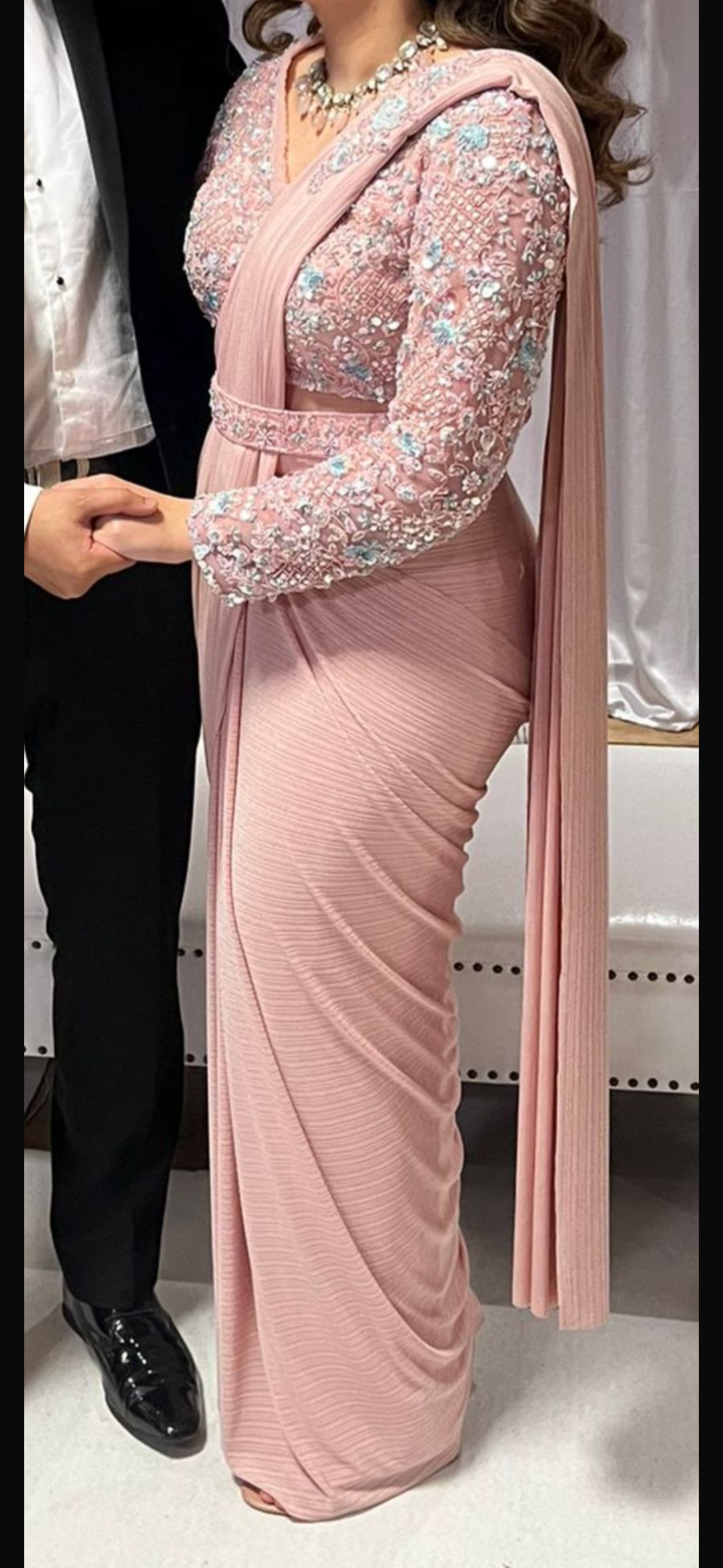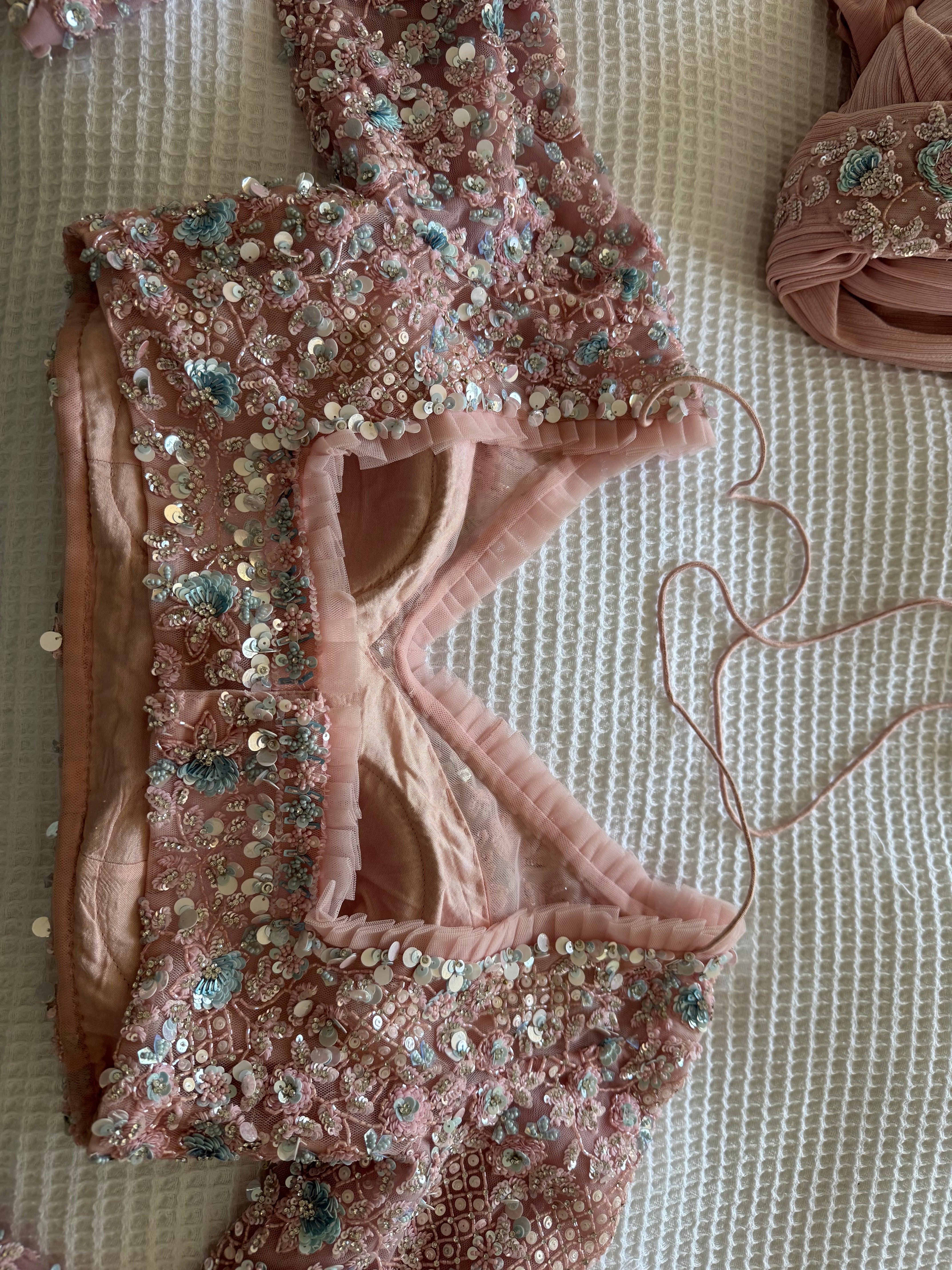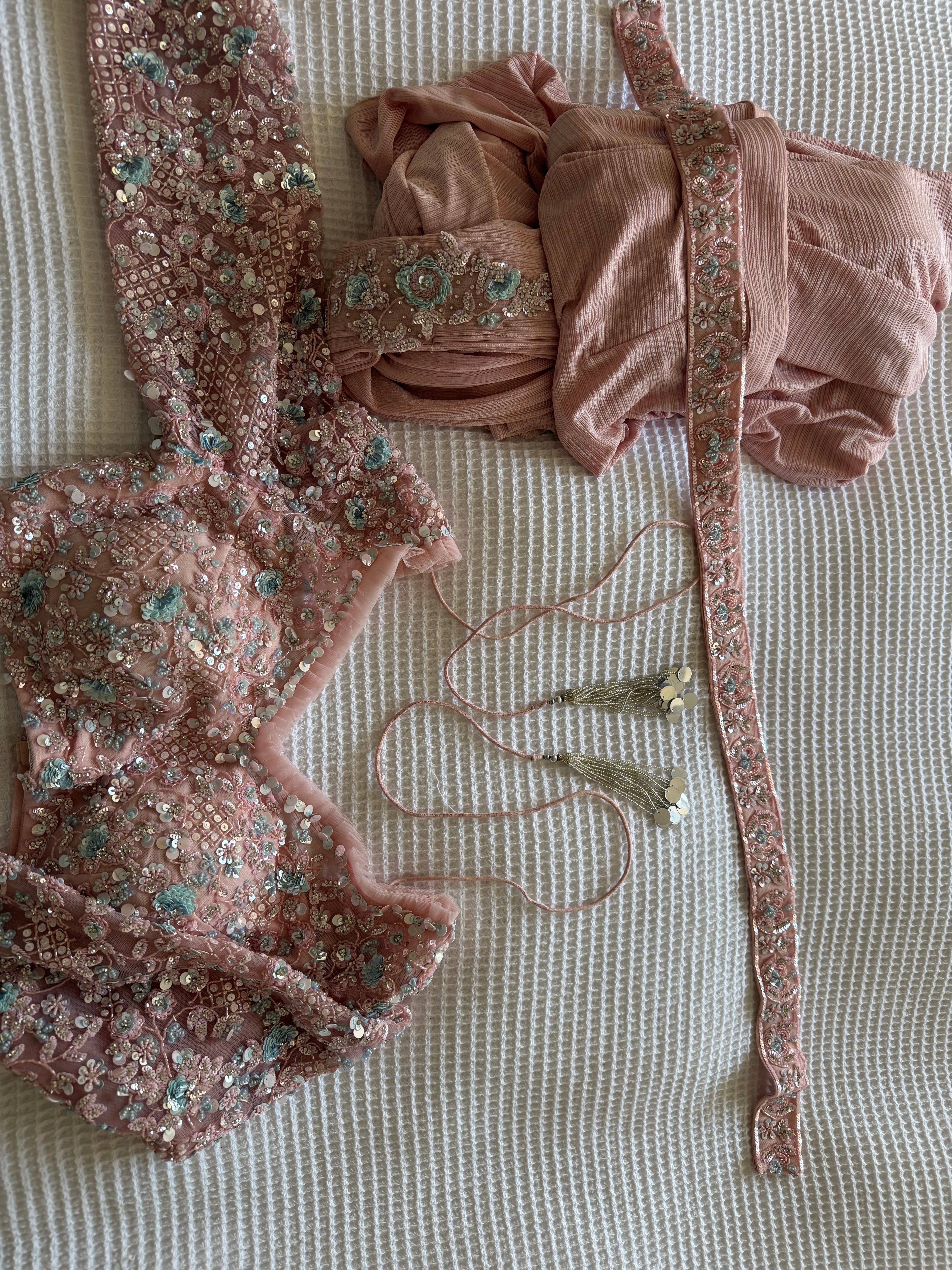 I wore this once for my brothers engagement party. It’s a well fitted lycra pre-draped saree with a fully embroidered long sleeve blouse. I wanted something modern to wear and chose this, and received a lot of compliments on this too.