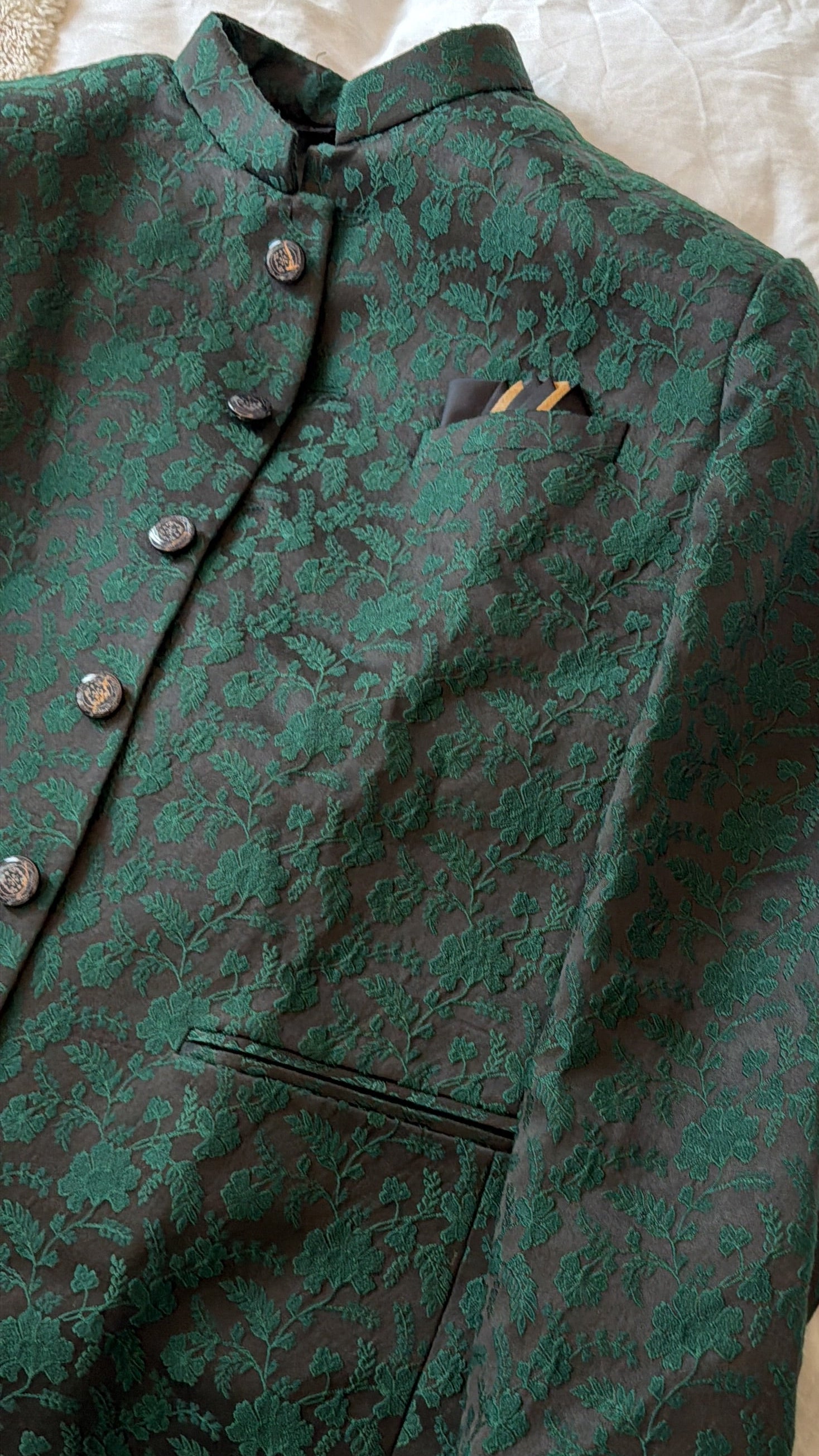 It’s a gorgeous green and black men’s blazer for Indian special occasions