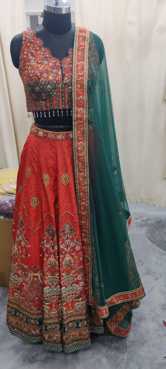 This vibrant orange-red and green lehenga set features intricate multicolour floral and traditional motif embroidery, paired with a delicately embellished sleeveless blouse. The look is completed with a deep green sheer dupatta with ornate borders, creating a rich festive ensemble perfect for wedding celebrations.