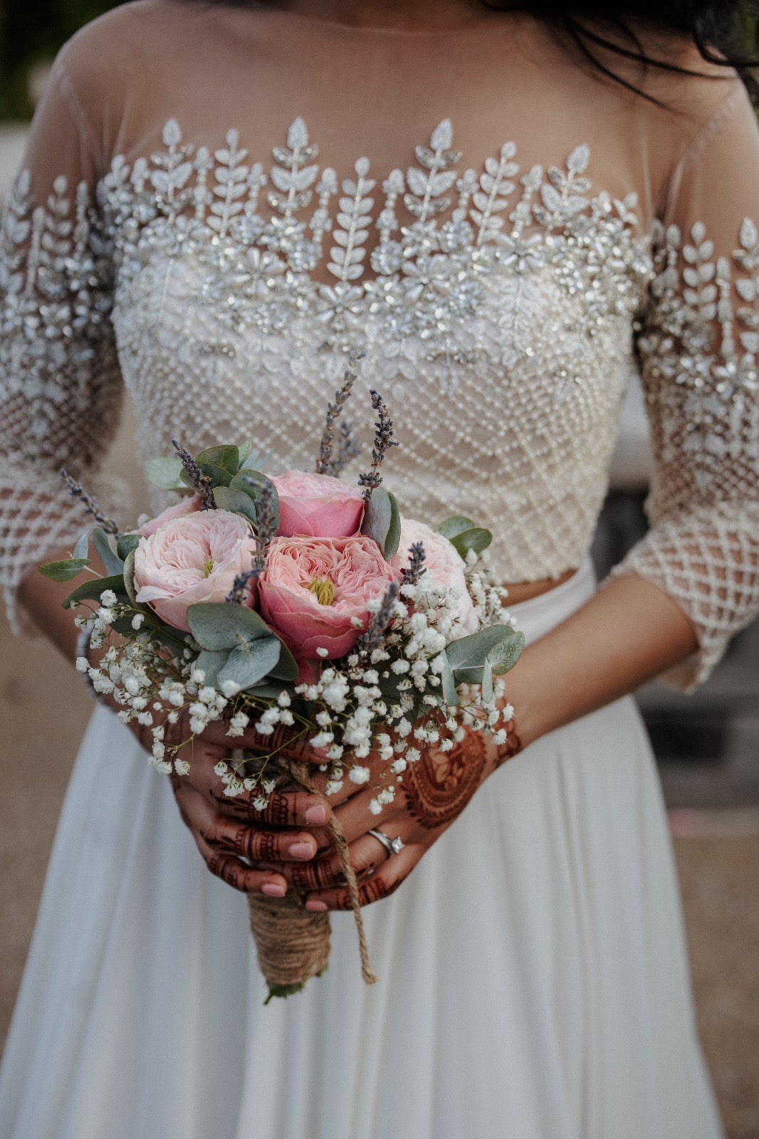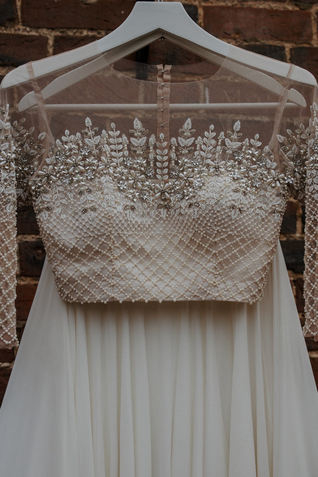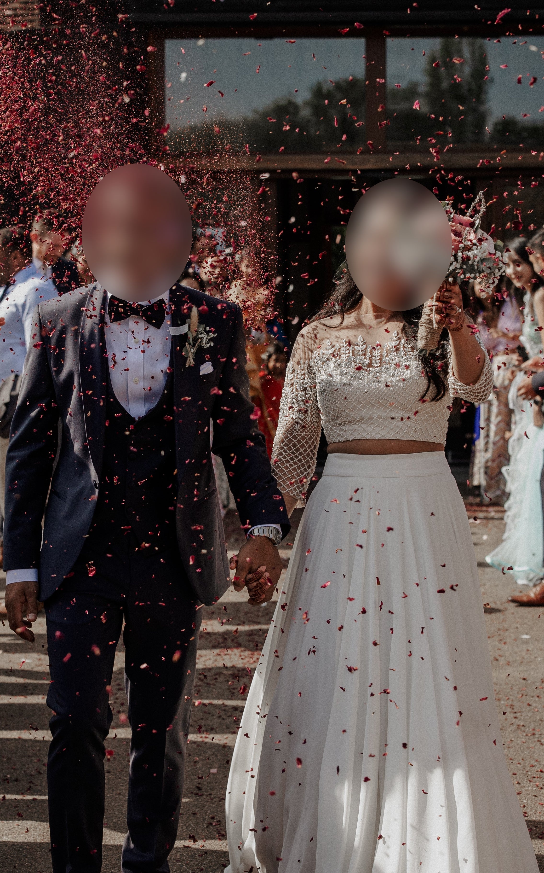 Gorgeous custom-made Pearl embroidered blouse, and flowy white skirt skirt. The fit is flattering and comfortable, allowing movement while remaining structured. It would suit a UK size 6-8. It’s in excellent condition and ready to make another bride feel just as special!
