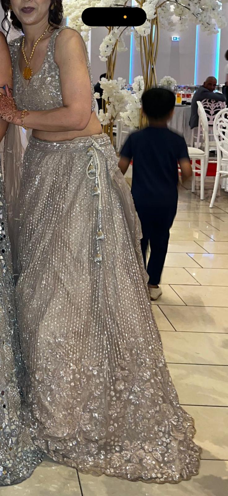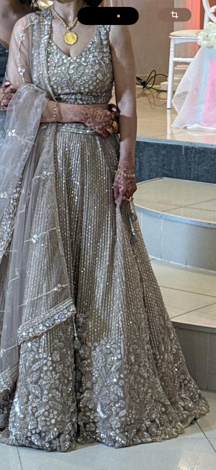 This silver-grey lehenga features intricate tonal embroidery with sequins and beadwork, creating a soft, luminous shimmer across the fabric. The blouse is delicately embellished with floral motifs, complementing the finely pleated skirt and detailed hemline. Paired with a sheer dupatta with subtle embroidery, the look is elegant, understated, and timeless.