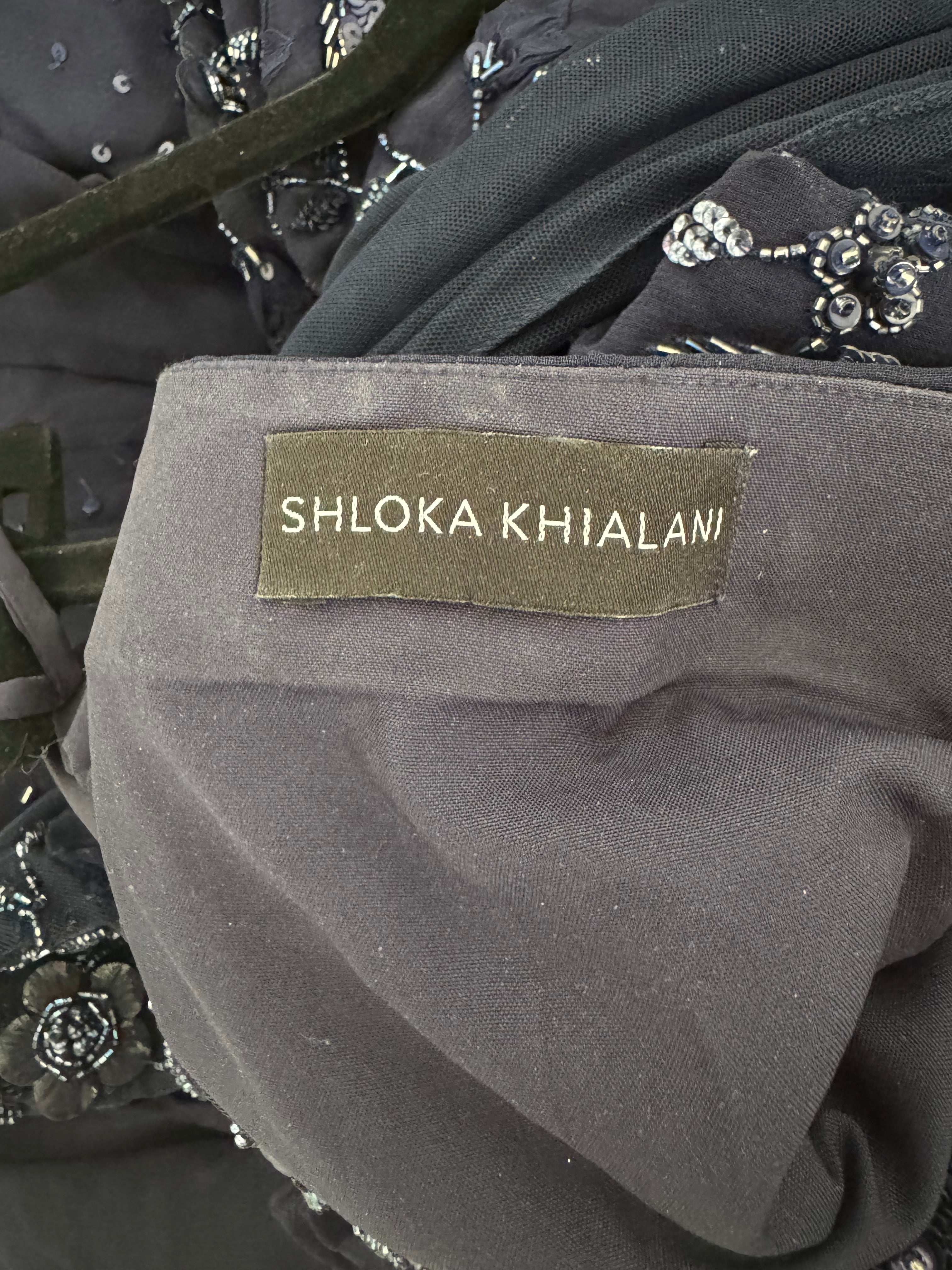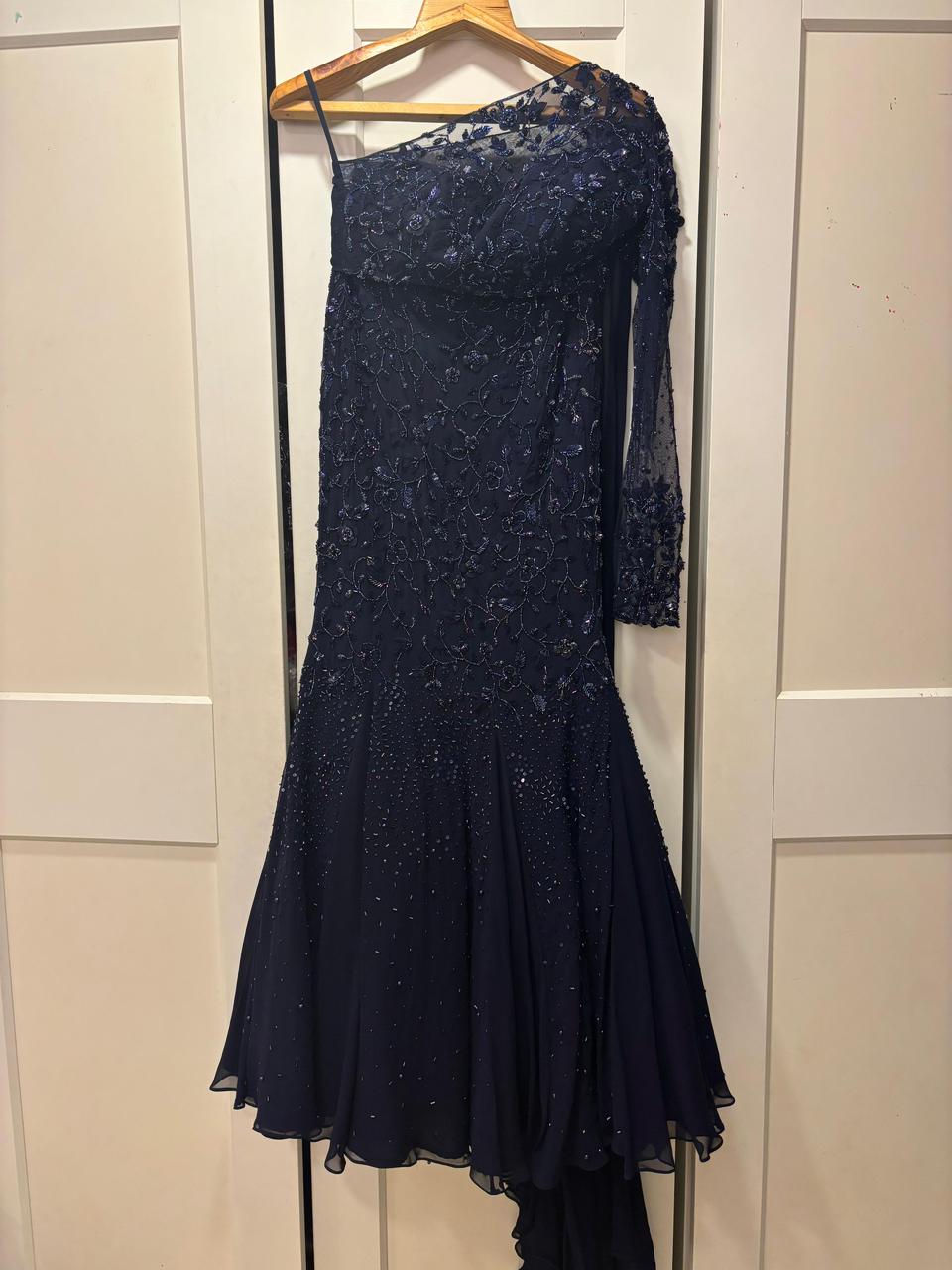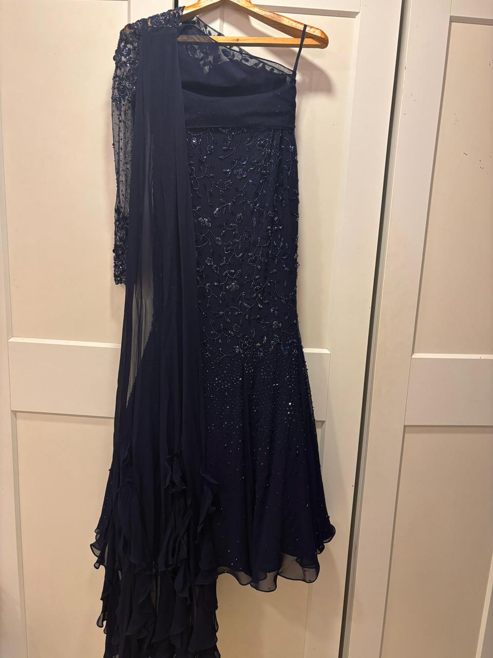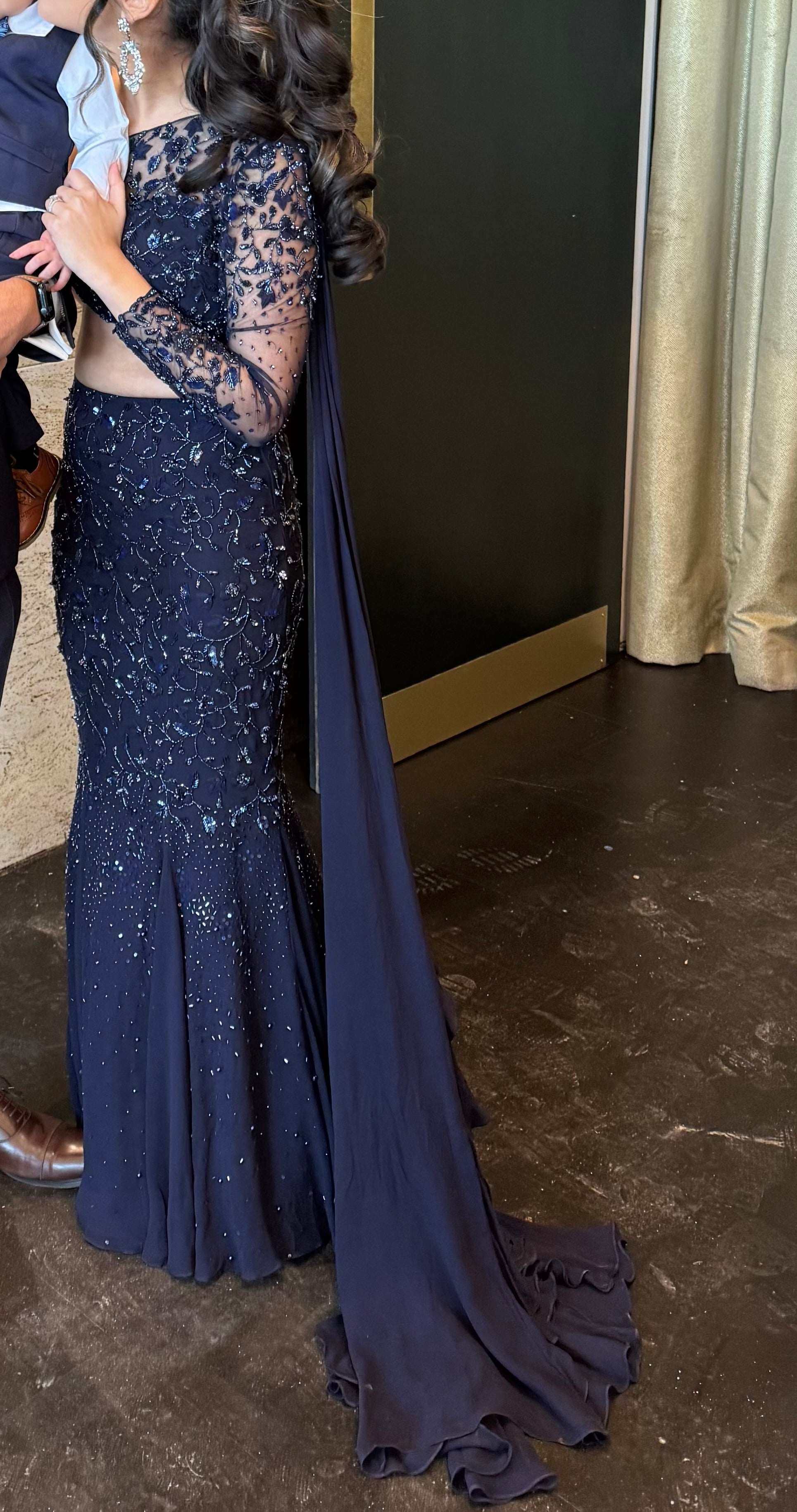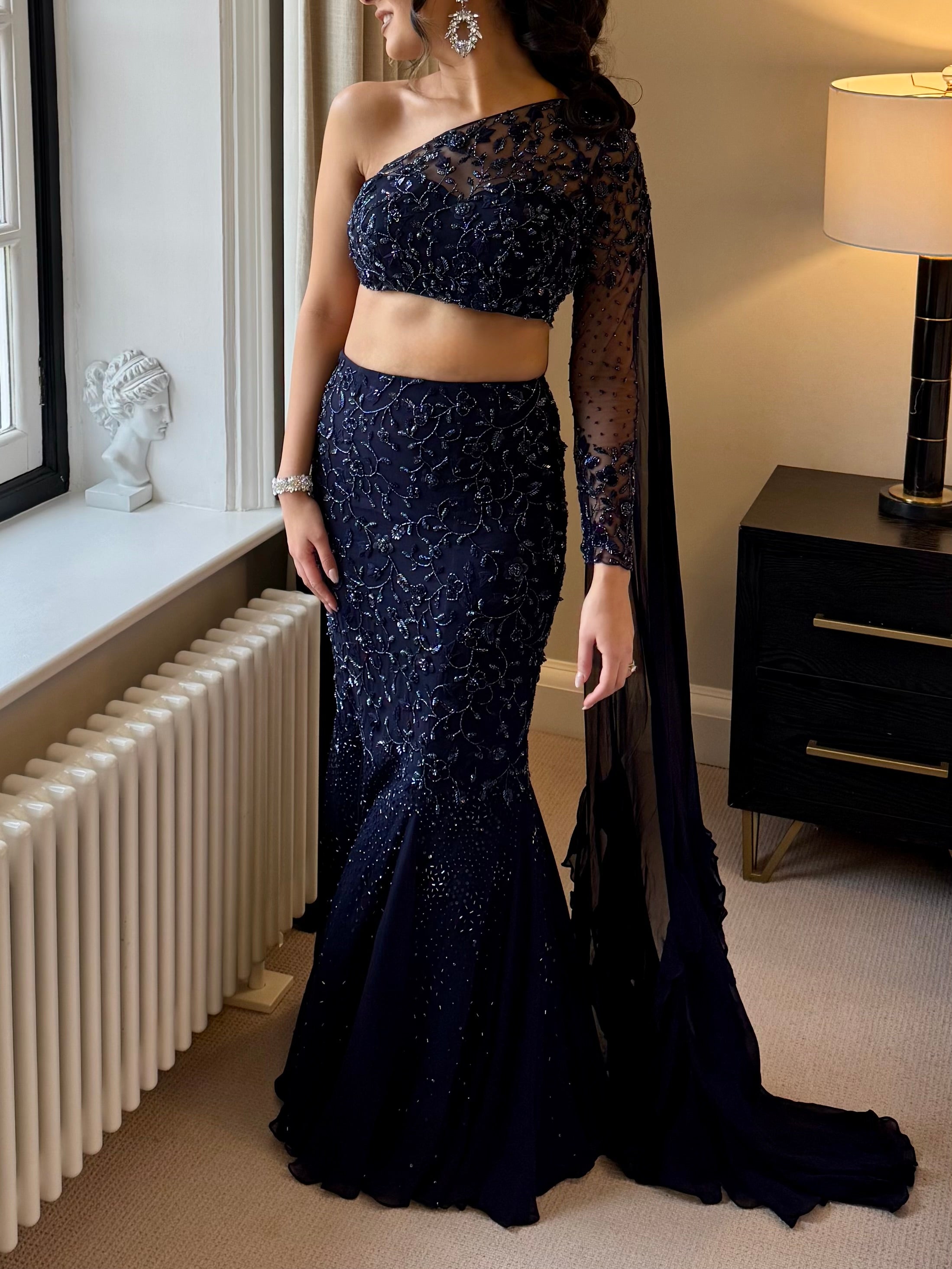 This stunning Shloka Khialani Navy Blue One-Shoulder Ensemble is the perfect statement look for a special occasion. The set features a fit-and-flare fishtail skirt that beautifully flatters the silhouette, paired with a one-shoulder top adorned with an elegant drape cascading from the shoulder. Perfect for weddings, receptions, or any evening event where you want to stand out!