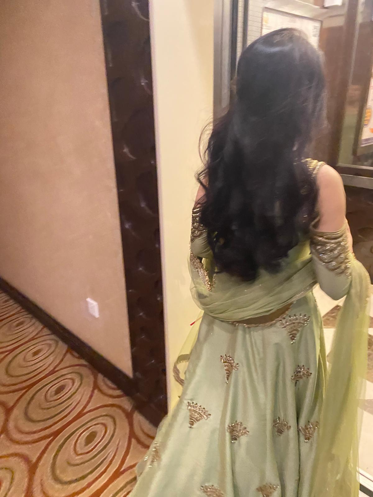 This elegant green anarkali-style lehenga with delicate gold embroidery and sequin detailing, creating a subtle shimmer. The cold-shoulder blouse features intricate embellishments, paired with a sheer dupatta finished with a rich embroidered border. Overall, it has an elegant, flowy silhouette with a refined, festive appeal.