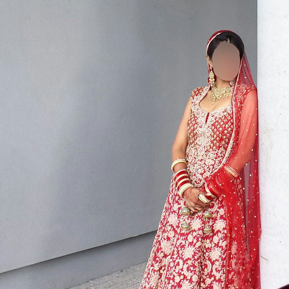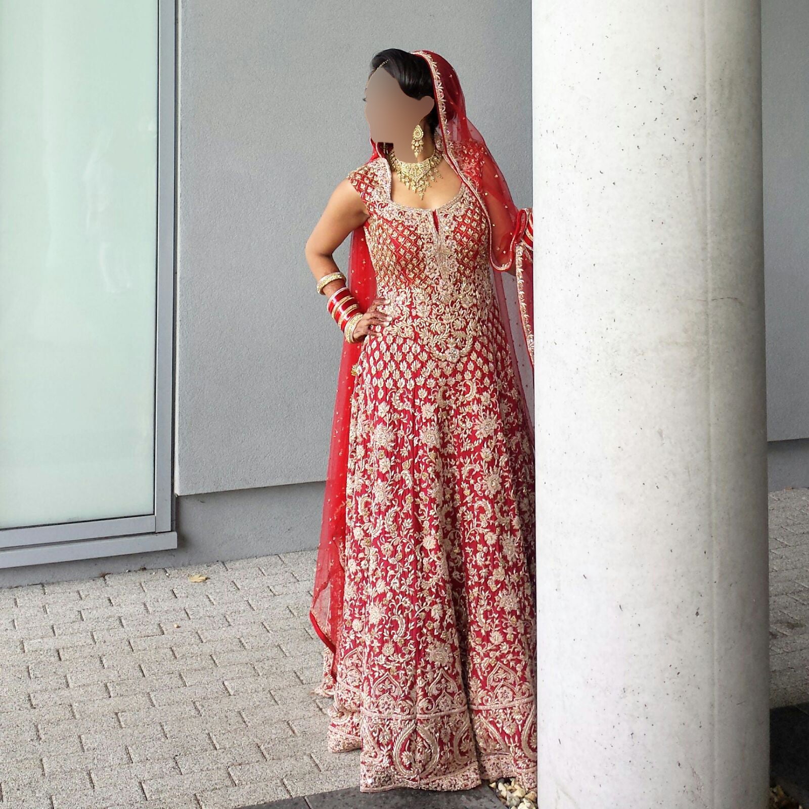 Stunning Mongas wedding gown in a rich red colour with intricate gold embroidery throughout. One-piece with an elegant high collar perfect for bridal wear. Worn only once and in excellent condition.