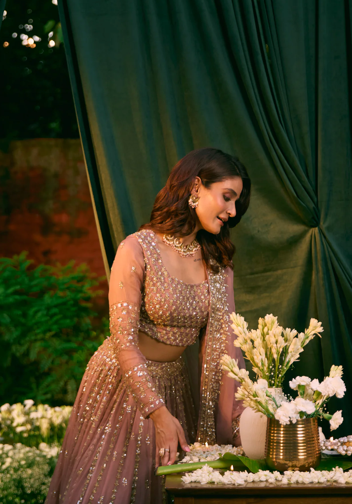 Onion Pink Lehenga on tissue fabric with beautiful gold work all over the blouse and a matching dupatta.