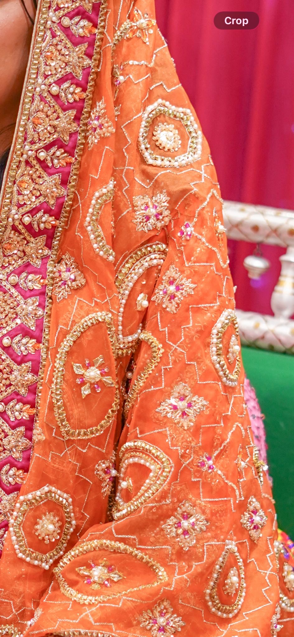 Get your hands on this beautiful orange and pink sharara with a beautiful flowy skirt and embelished dupatta.